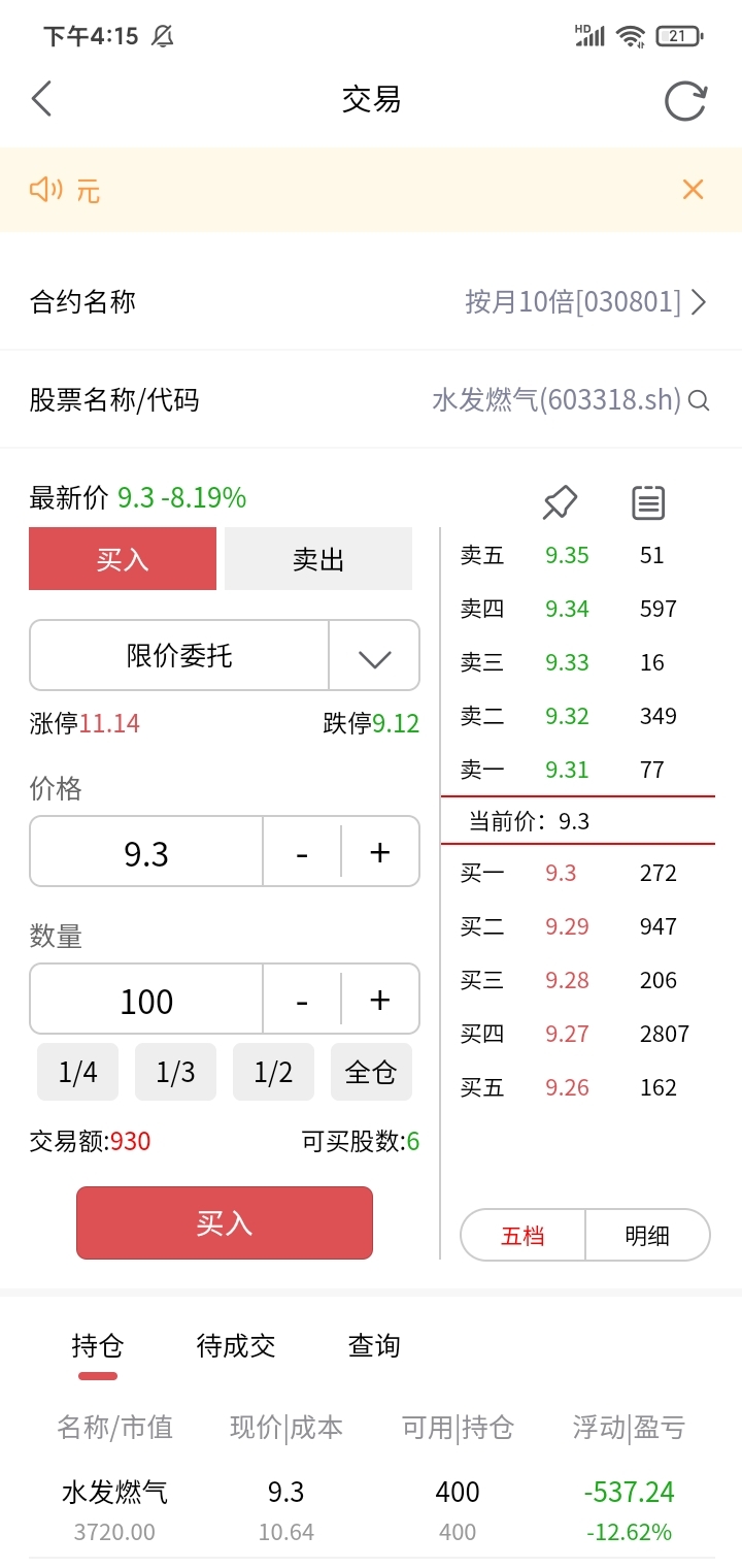$水发燃气(SH603318)$ 明天开盘百分百9.8