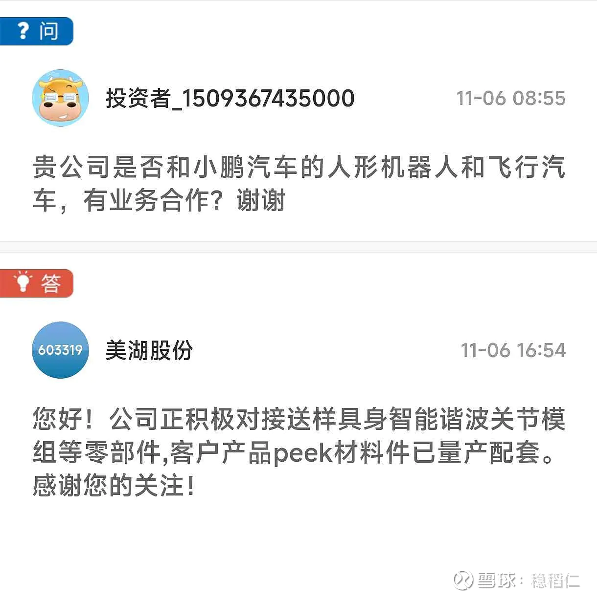 $美湖股份(SH603319)$ 董秘回复了,供应小鹏机器人。而且从包裹里面的仿肌肉来看,这次的机器人应该是用了美湖提供的轻量化材料。$方正电机(SZ002196)$ $汉宇集团(SZ300403)$
