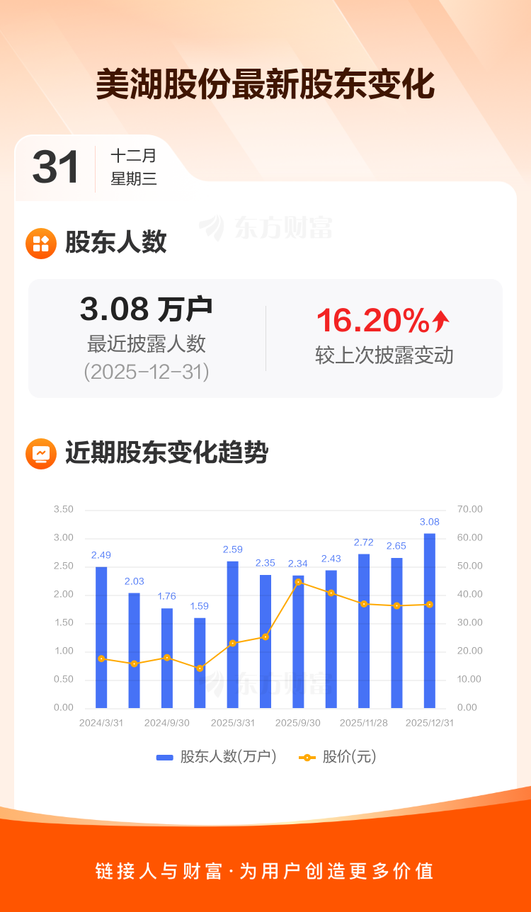 美湖股份最新披露数据显示,截至12月31日公司股东户数为3.08万户,较上期(2025年12月19日)增加4289户,增幅为16.20%。户均持有流通股数量由上期的1.28万股下降至1.10万股,户均持股金额由上期的46.24万元减少至40.32万元。