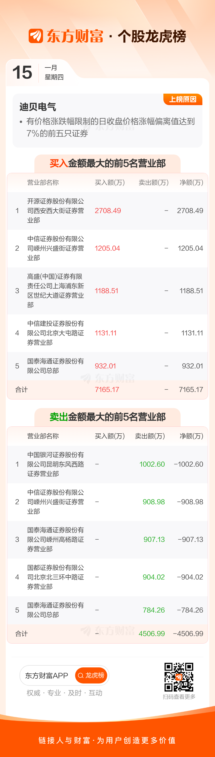 交易所2026年1月15日公布的交易公开信息显示,迪贝电气因成为有价格涨跌幅限制的日收盘价格涨幅偏离值达到7%的前五只证券上榜。迪贝电气当日收报20.88元,涨跌幅10.01%,偏离值10.34%,换手率11.24%,成交额3.44亿。