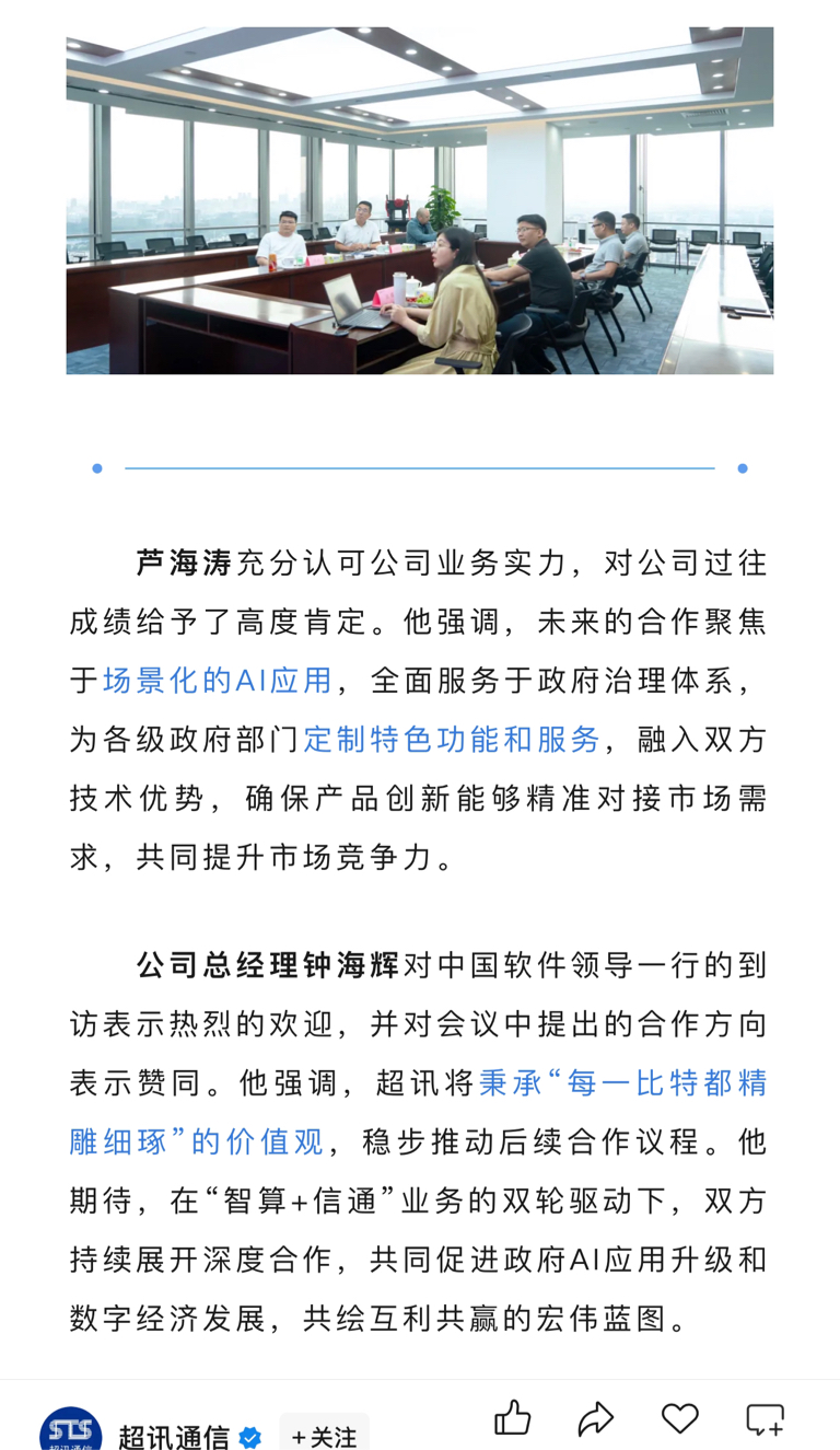 超讯通信:与中国软件未来的合作聚焦于场景化的AI应用,全面服务于政府治理体系,为