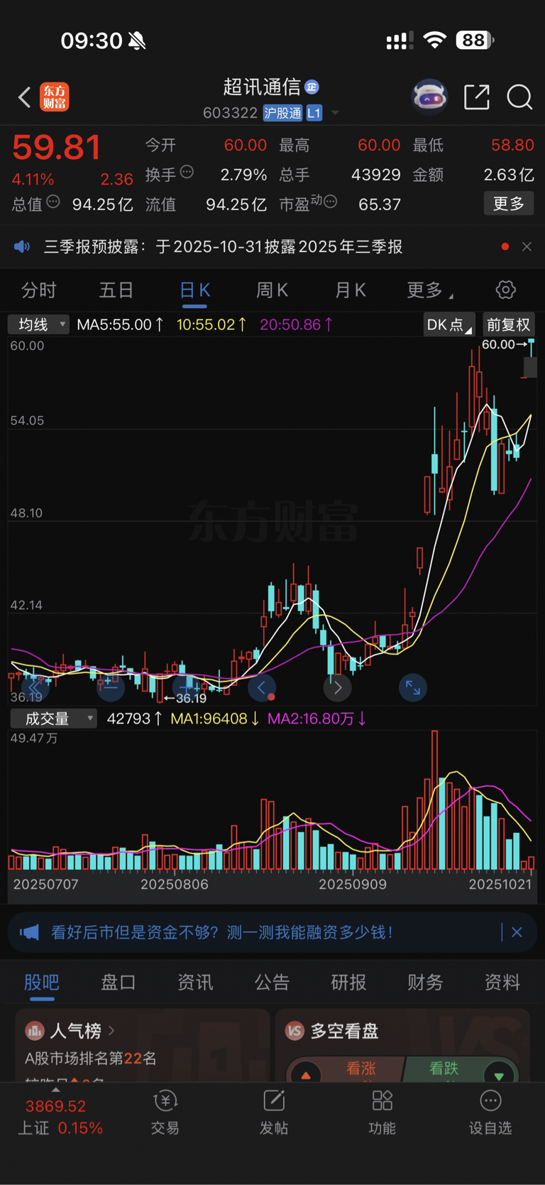 $超讯通信(SH603322)$ 今天集合竞价有量,说明资金已经关注,今天打板咯