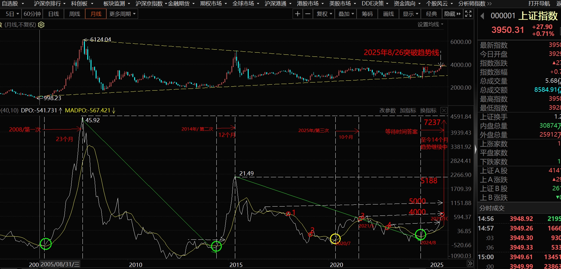 $超讯通信(SH603322)$ 牛市判断,月线周期的DPO我测试调制出这个参数,准确显现A股只有2008 ,2015,和2025年真正突破它的均线,其他时间都在均线下被压制,2015-2024期间有过4次上穿但都是假的突破,只有20258月线突破后保持了三个月。在观察和验证中。历史能在均线上维持半年以上只有四次,2025
