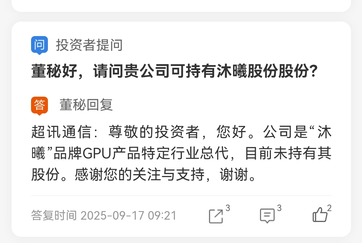$超讯通信(SH603322)$ 董秘都说了没有持股沐曦股份,沐曦上市对它市值没有什么利好,沐曦产品销量好对它业绩才有利好,不如和而泰,直接持股摩尔线程,摩尔线程上市市值增加,和而泰直接收益,最近走势也没有和而泰强势,资金不认可可超讯通信,