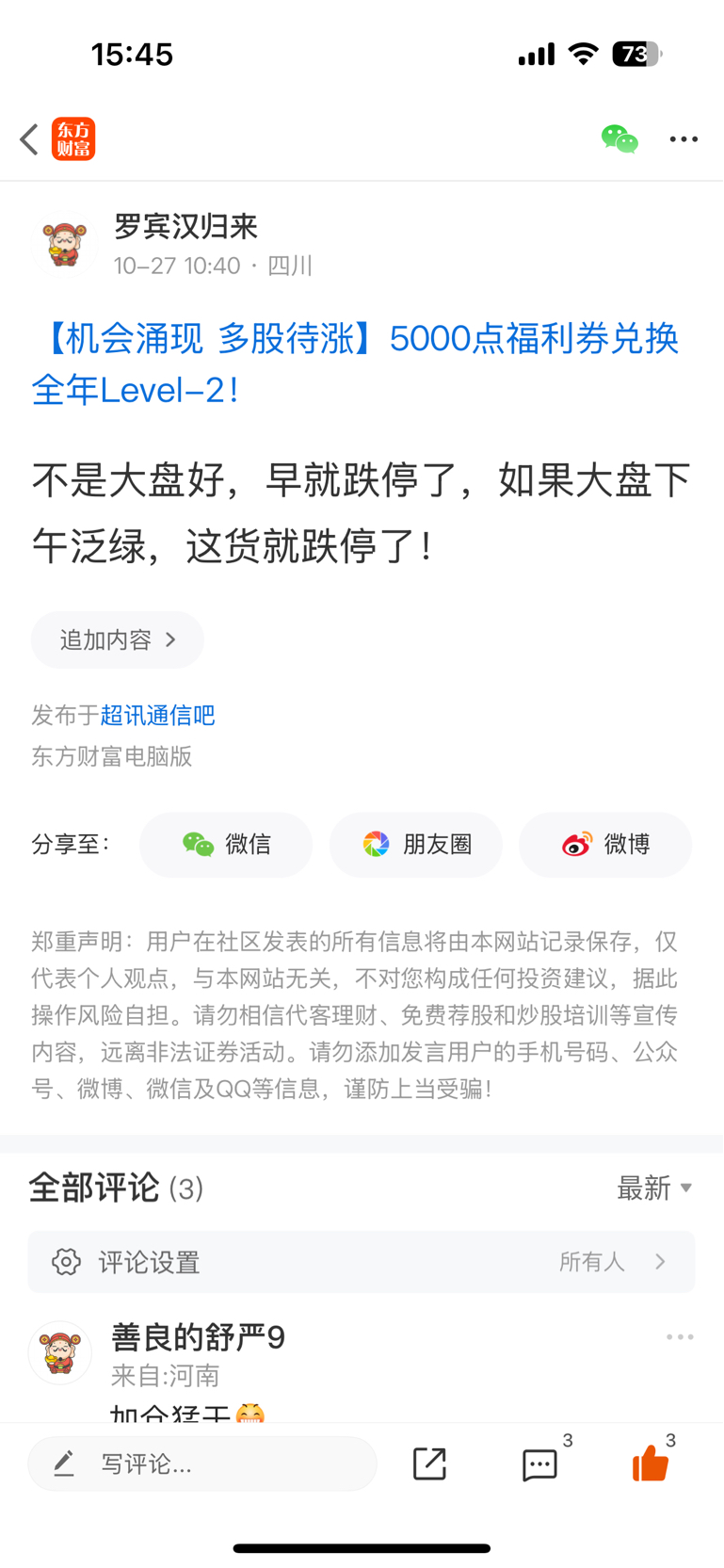 温馨提示: 1.根据《证券法》规定,禁止编造、传播虚假信息或者误导性信息,扰乱证券市场;2.用户在本社区发表的所有资料、言论等仅代表个人观点,与本网站立场无关,不对您构成任何投资建议。用户应基于自己的独立判断,自行决定证券投资并承担相应风险。《东方财富社区管理规定》
