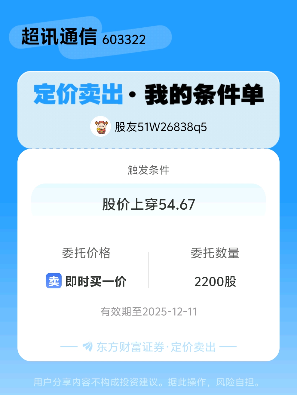 #条件单交流#  一位股神设置了一个定价卖出条件单,接下来就是见证奇迹的时刻~$超讯通信(SH603322)$