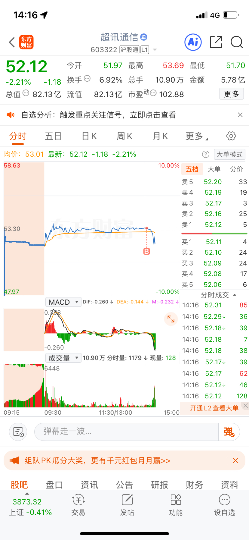 $超讯通信(SH603322)$ 难道是我进来了?横了一天,我一买就砸?