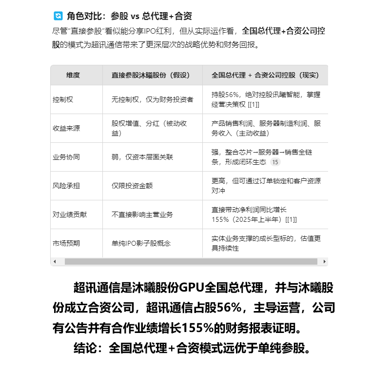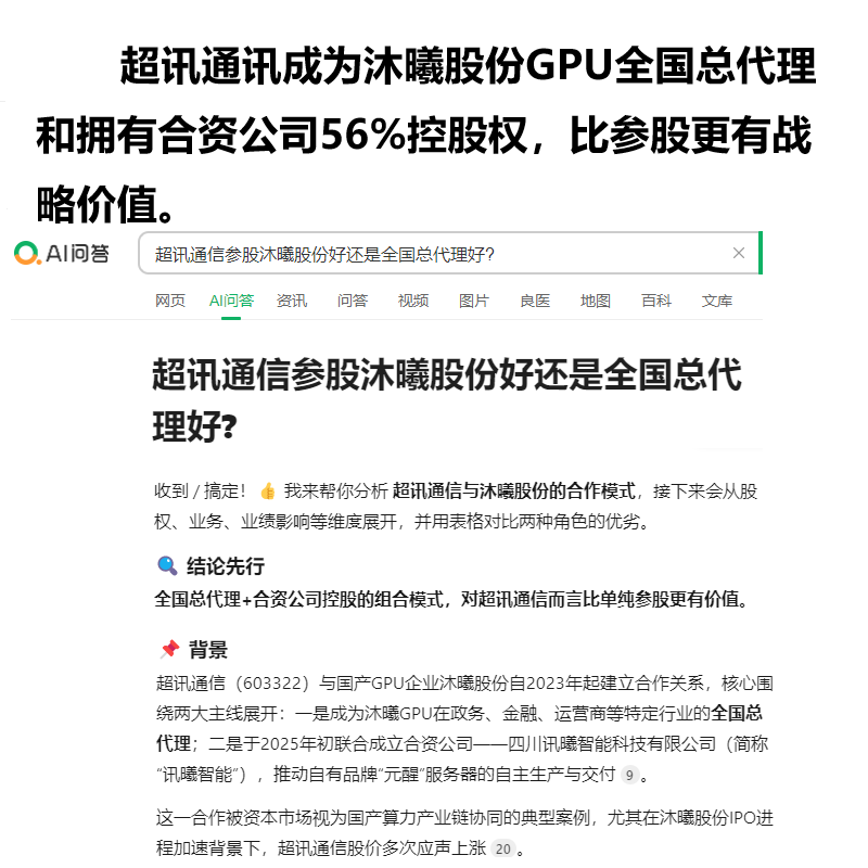 盯着参股三瓜两枣太肤浅,超信通讯的真正价值在于是沐曦股份GPU全国总代理,是合资公司56%的控股股东,有GPU经营权和服务器的生产权,所以,沐曦股份上市最大受益者是超信通讯。