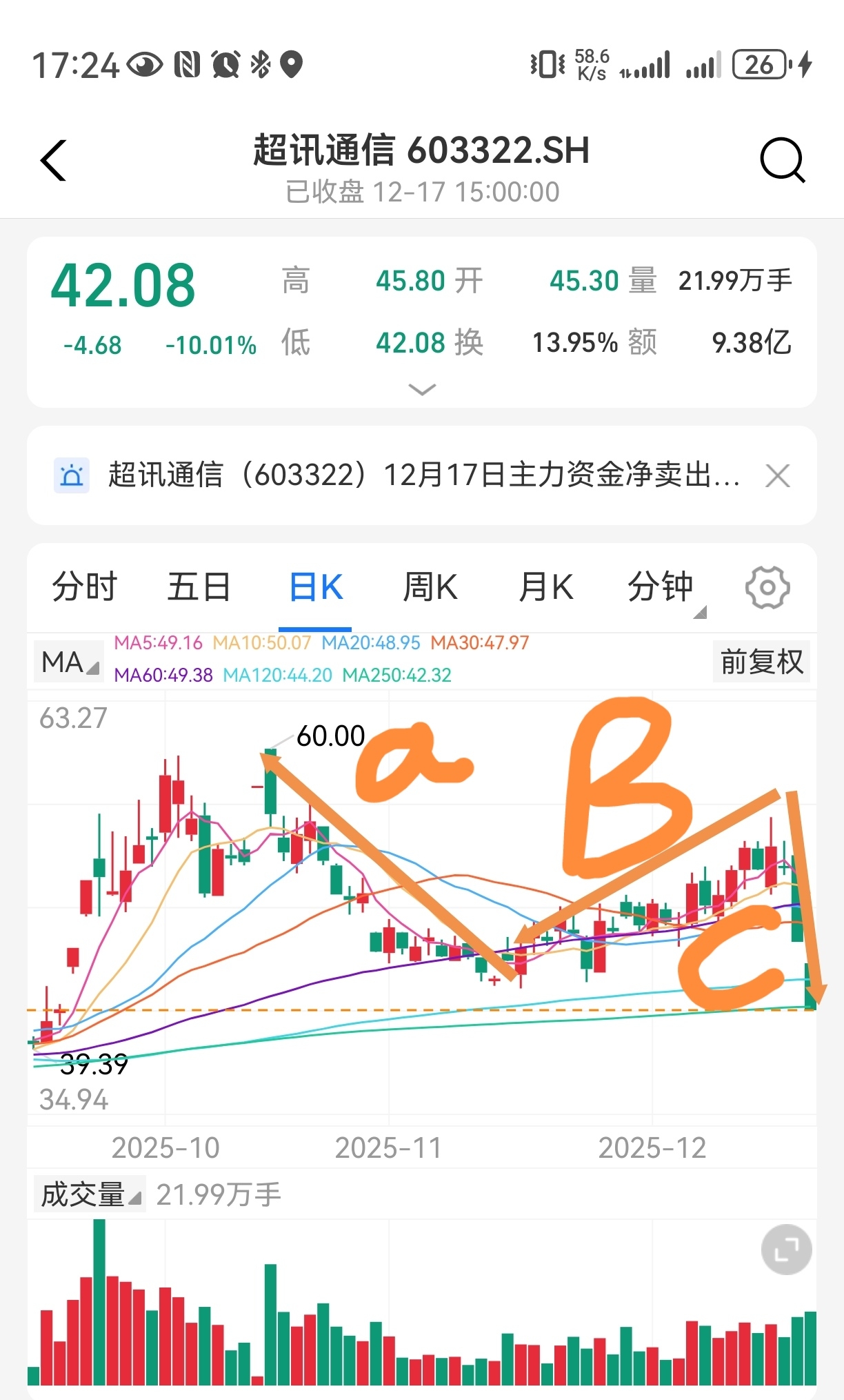 $超讯通信(SH603322)$ 不要悲观,下跌C浪已经确立,基本到位,破40大胆加仓干