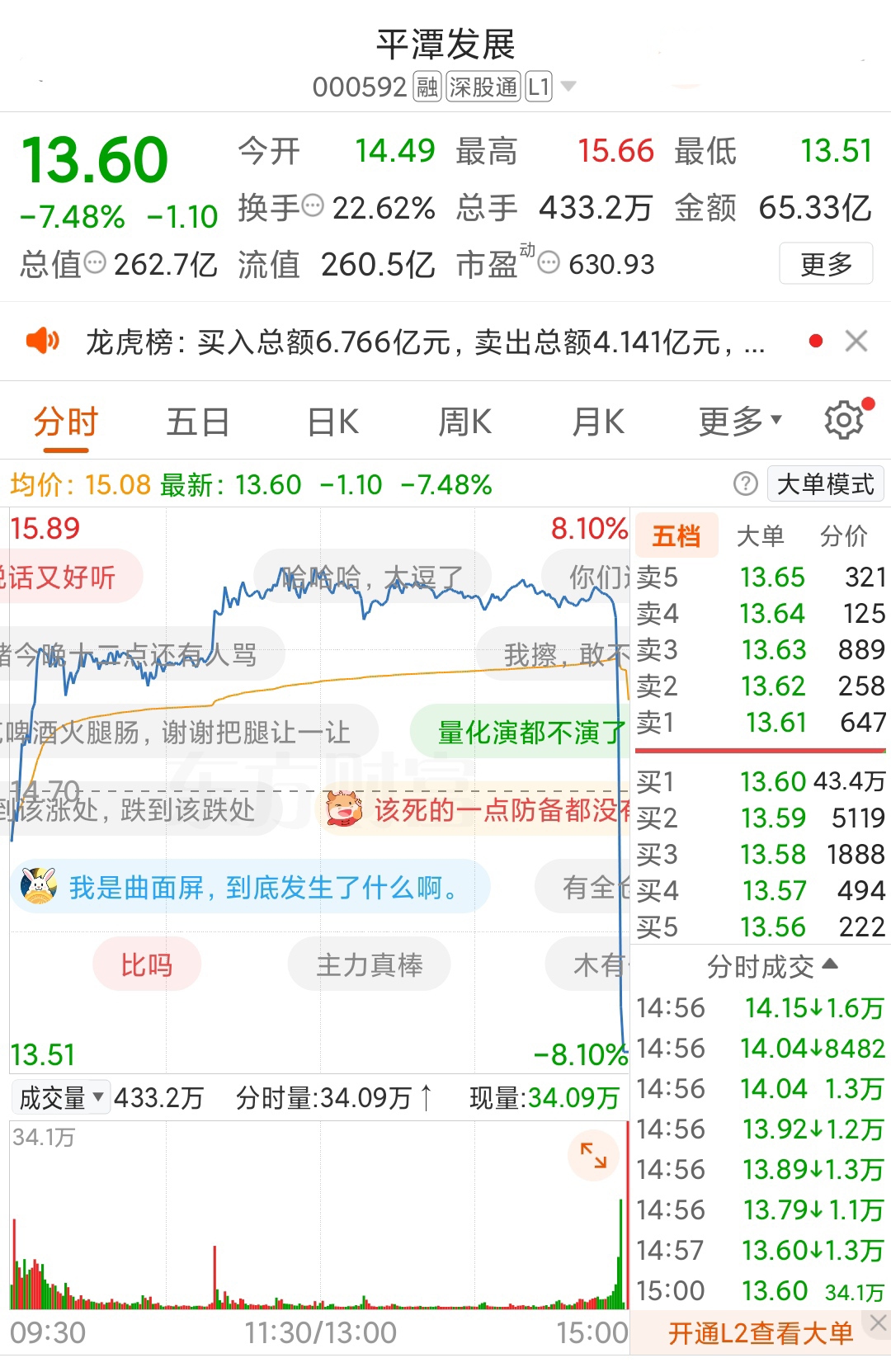 平潭发展今天尾盘1分钟从红6个点到绿7.5个点,当天买入的亏损13个多点,目前晚