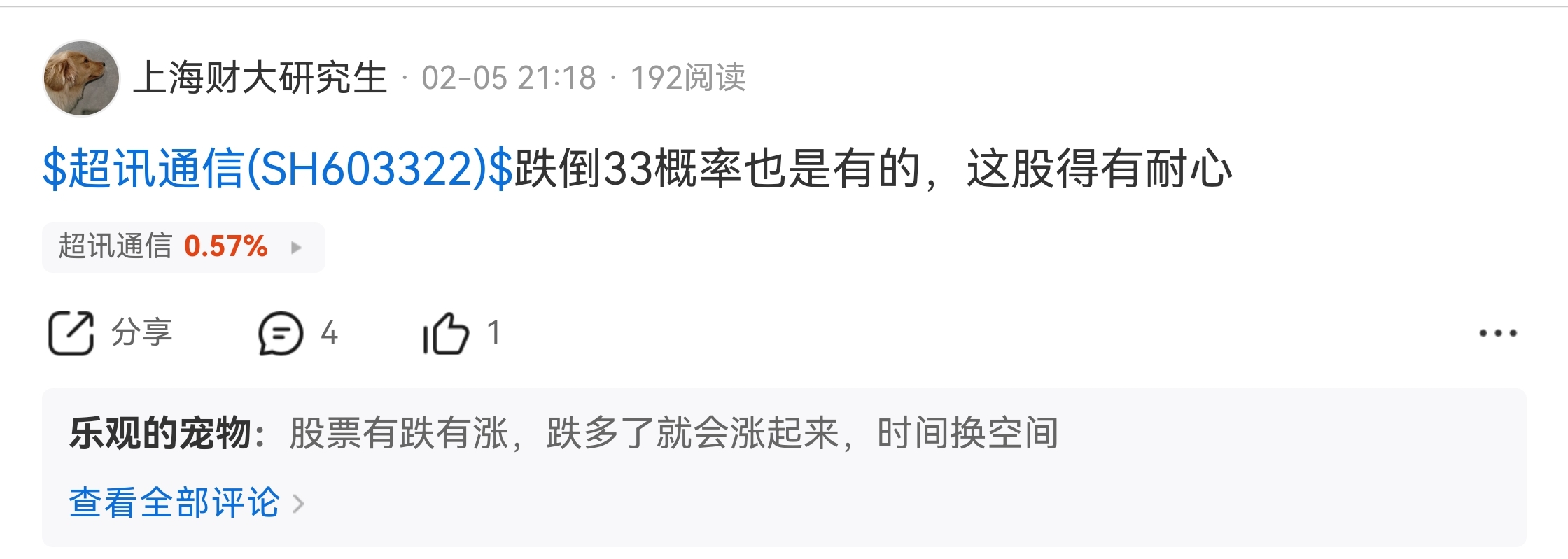 $超讯通信(SH603322)$ 之前就说了,这股跌倒33完全可能。他是完全庄家控盘的,看好就继续持有,不看好走人就行