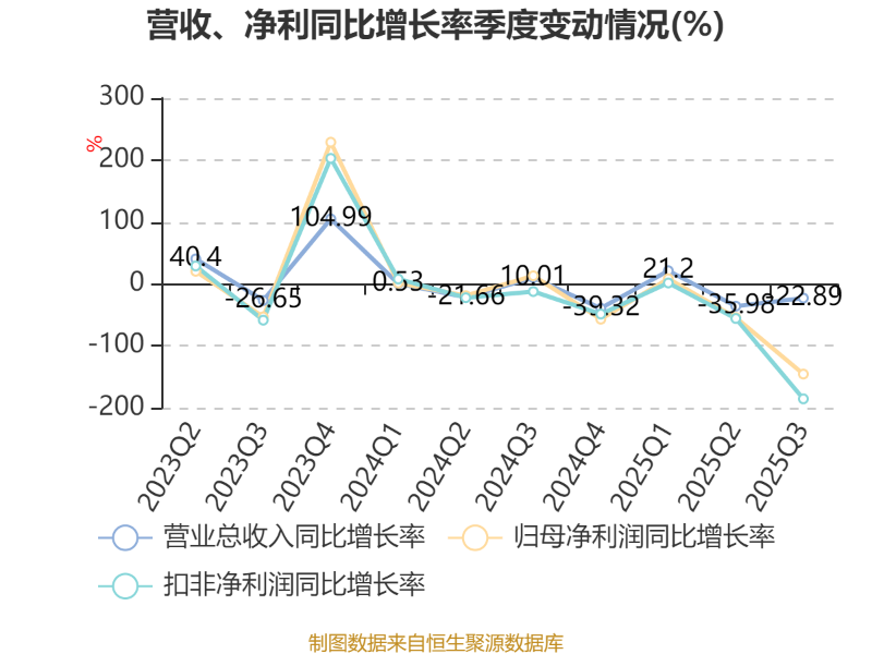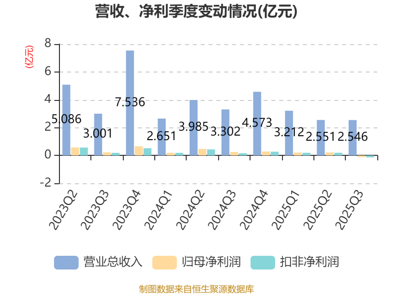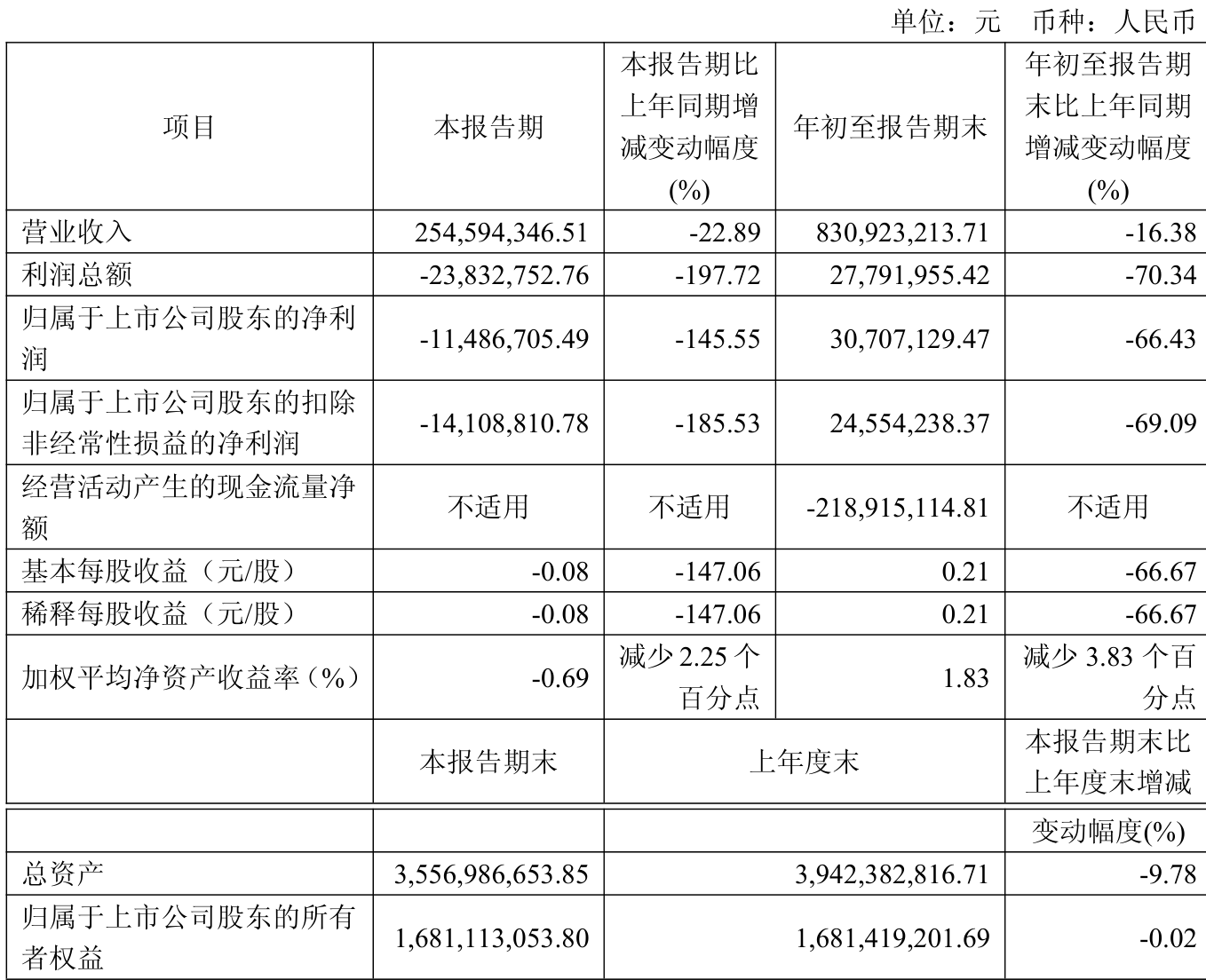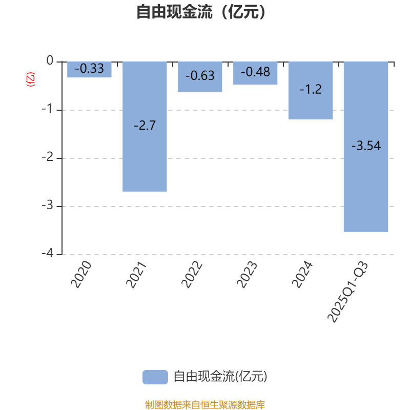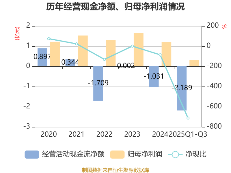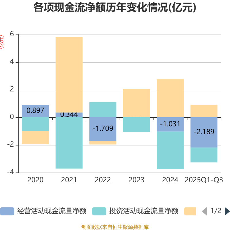 2025年前三季度,公司经营活动现金流净额为-2.19亿元,同比增加1.7亿元;筹资活动现金流净额9129.05万元,同比减少1.91亿元;投资活动现金流净额-1.08亿元,上年同期为-2.23亿元。
