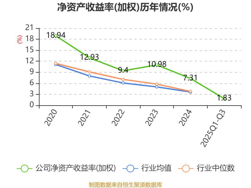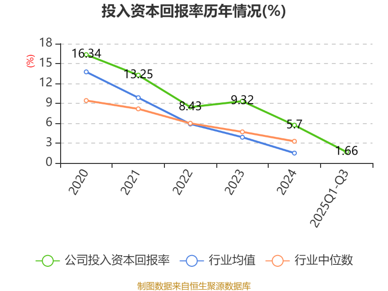 盈利能力方面, 2025年前三季度公司加权平均净资产收益率为1.83%,同比下降3.83个百分点。公司2025年前三季度投入资本回报率为1.66%,较上年同期下降2.75个百分点。