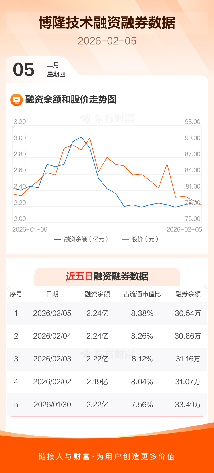 交易所最新数据显示,博隆技术于2026年2月5日获融资买入434.44万元,融资偿还369.64万元,当日融资净买入64.8万元。目前,该股融资余额2.24亿,占流通市值比例为8.38%。