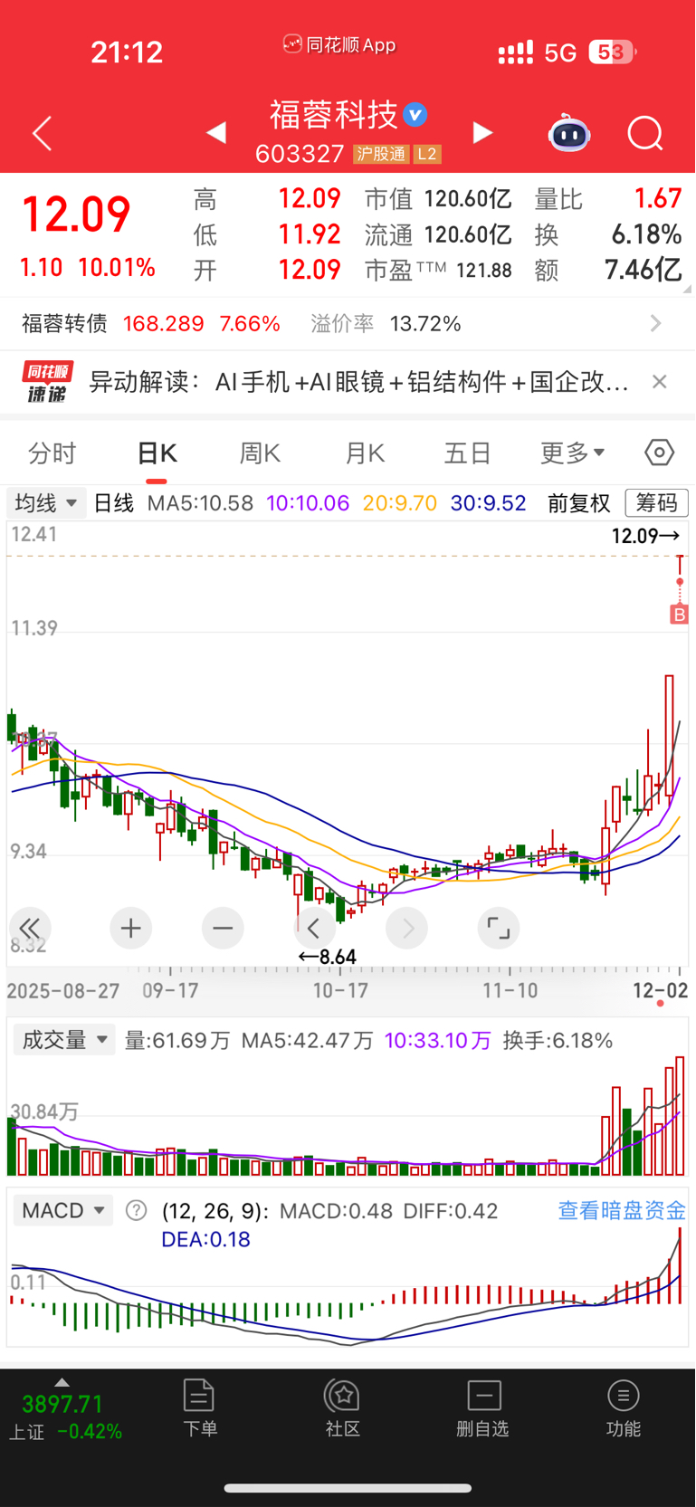 12月2日:买入福㯴科技。操作记录请勿跟票,你的赢亏自己负责。