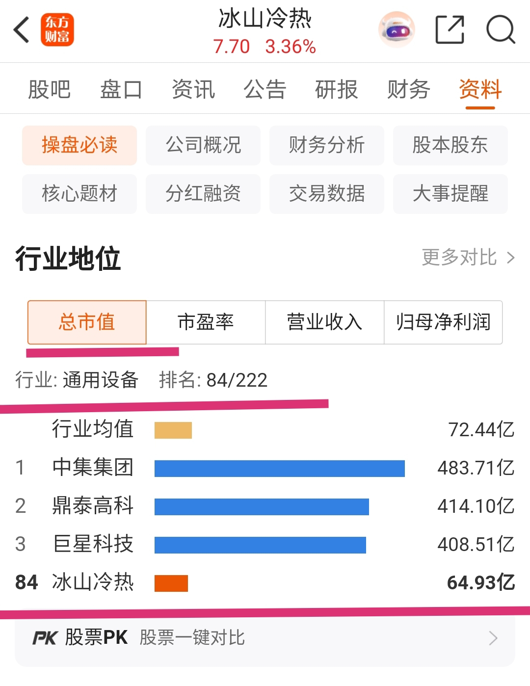 2025年三季报净利润8486.71万元,行业排位为84/222,2025年12月3日总市值排在行业84位的冰山冷热(000530.SZ)总市值64.93亿元。