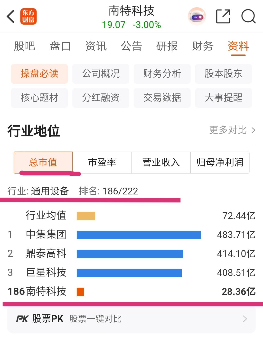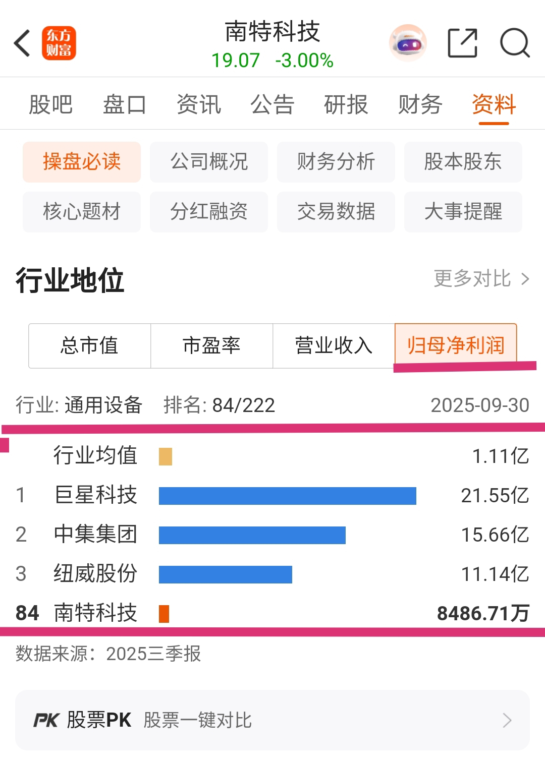 2025年12月3日南特科技总市值28.36亿元,行业排位为186/222(2025年12月3日股价19.07元/股)。