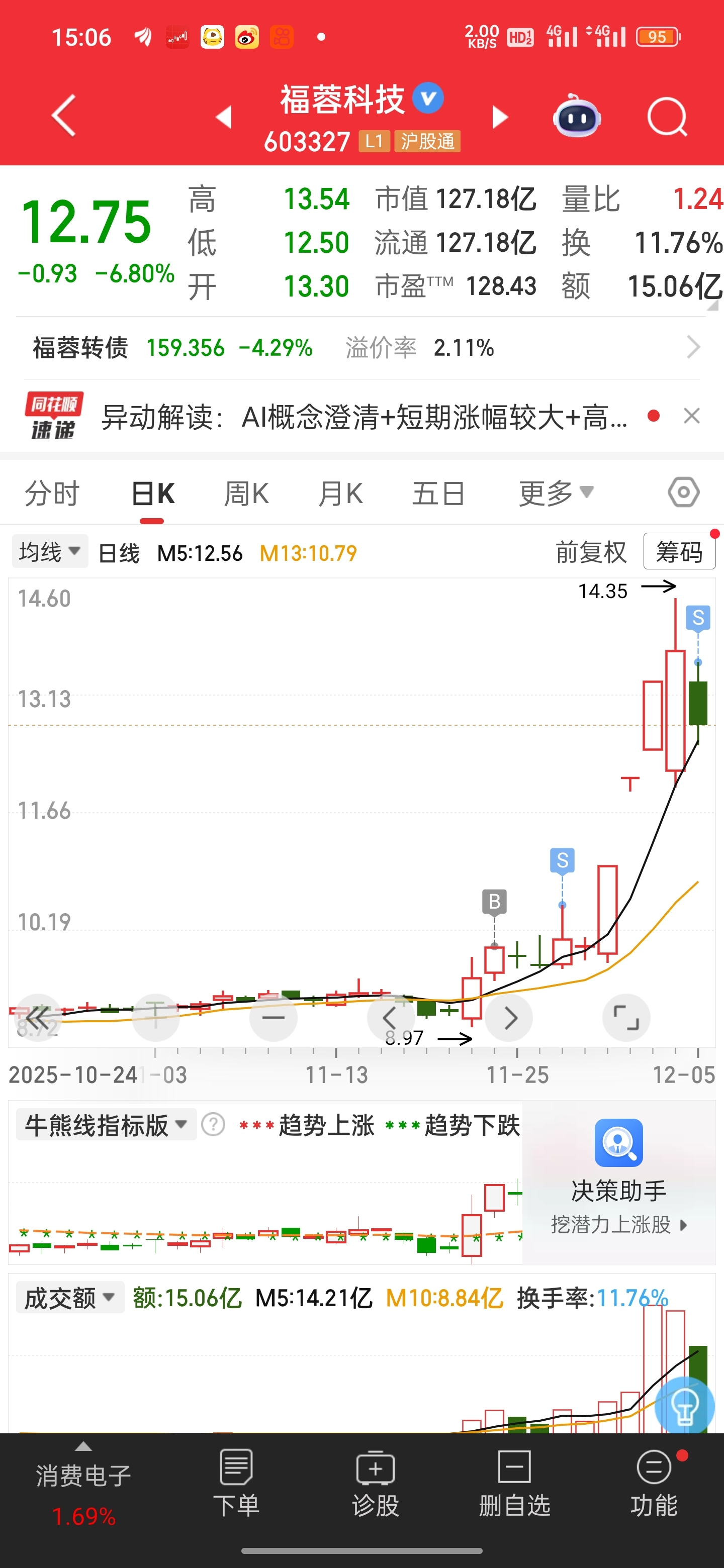 $福蓉科技(SH603327)$ 走了,后续或许还有机会,14块附近有较大的压力,震荡一会能过去就还行。我进小金属和电网设备了。$博威合金(SH601137)$ 还有一个新力金融$国电南瑞(SH600406)$