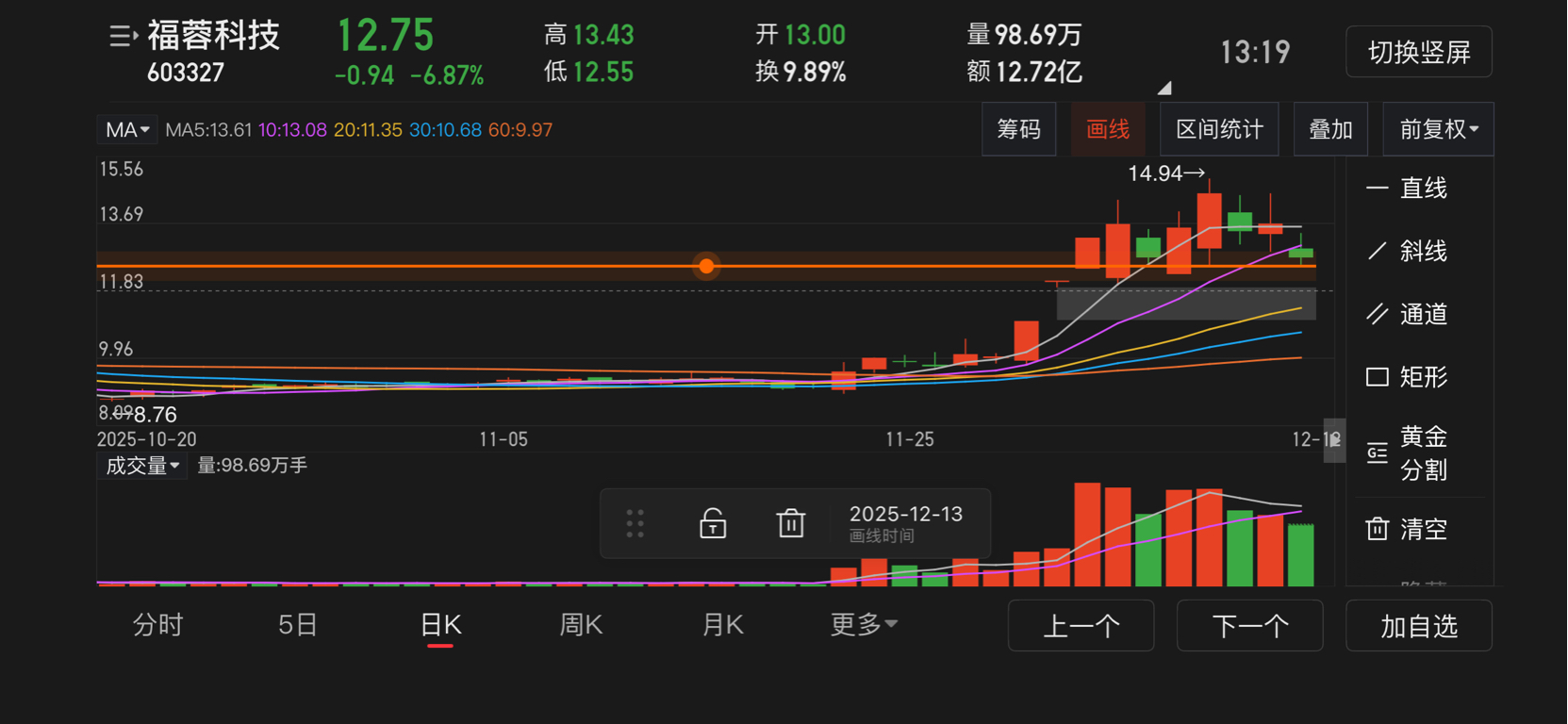 $福蓉科技(SH603327)$ 大家不要去问豆包,豆包说的不可信,我给大家分析我的观点,技术分析股价在5日10日的下方,距离5日10日线过远就形成了底背离,但是5日线还处于多头向上趋势,所以我认为周一大概率是反弹向上,看图这位置是12.55的支撑,破了这根线会去12.3附近,大家不要去恐慌,耐心持有