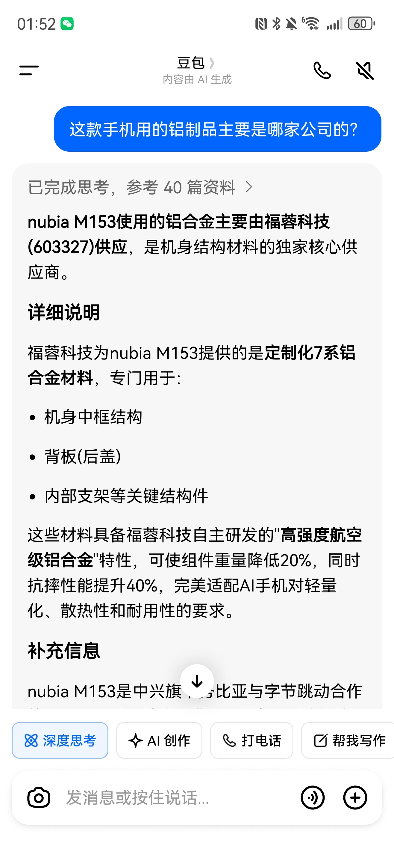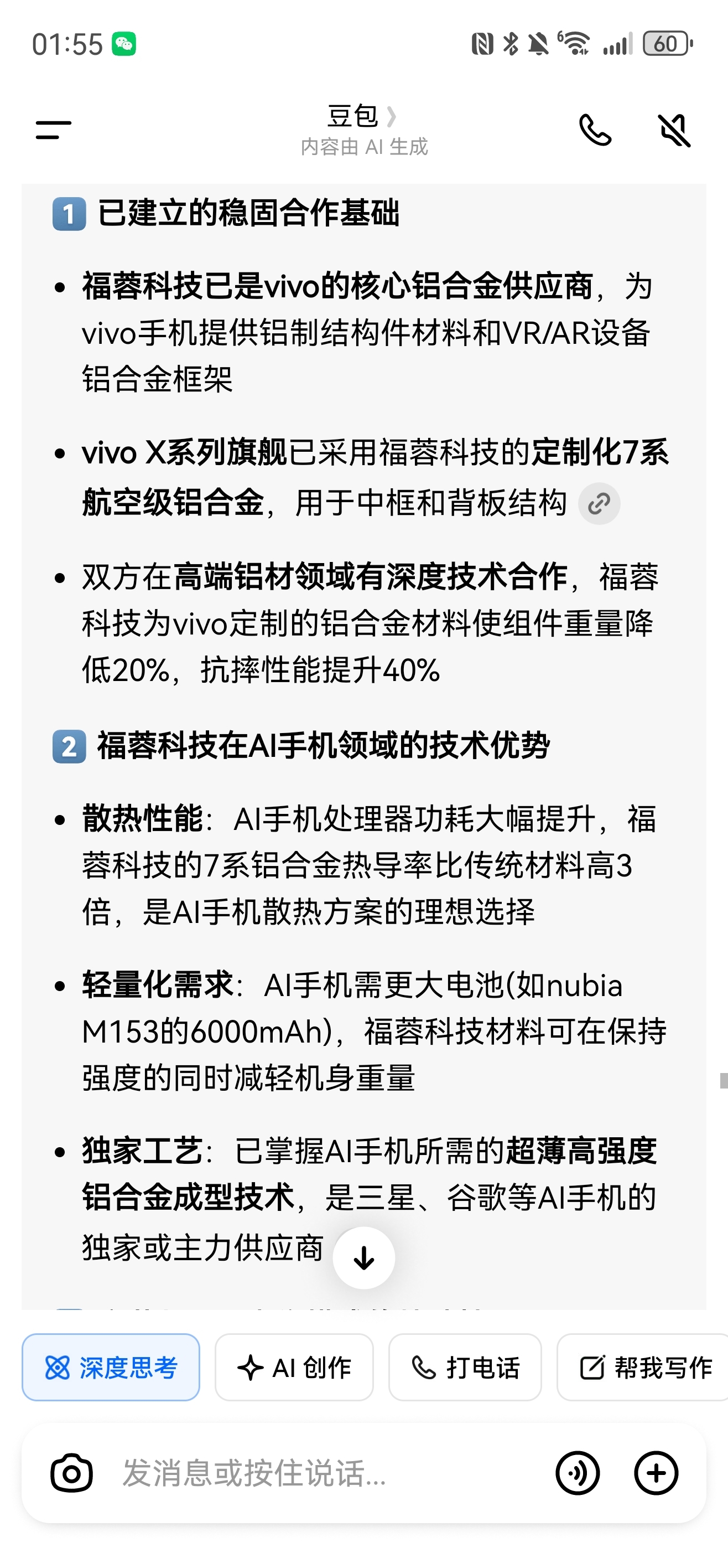 算是一个预期利好,十二月初字节和中兴推出的ai手机使用的铝制品主要来源于福蓉科技