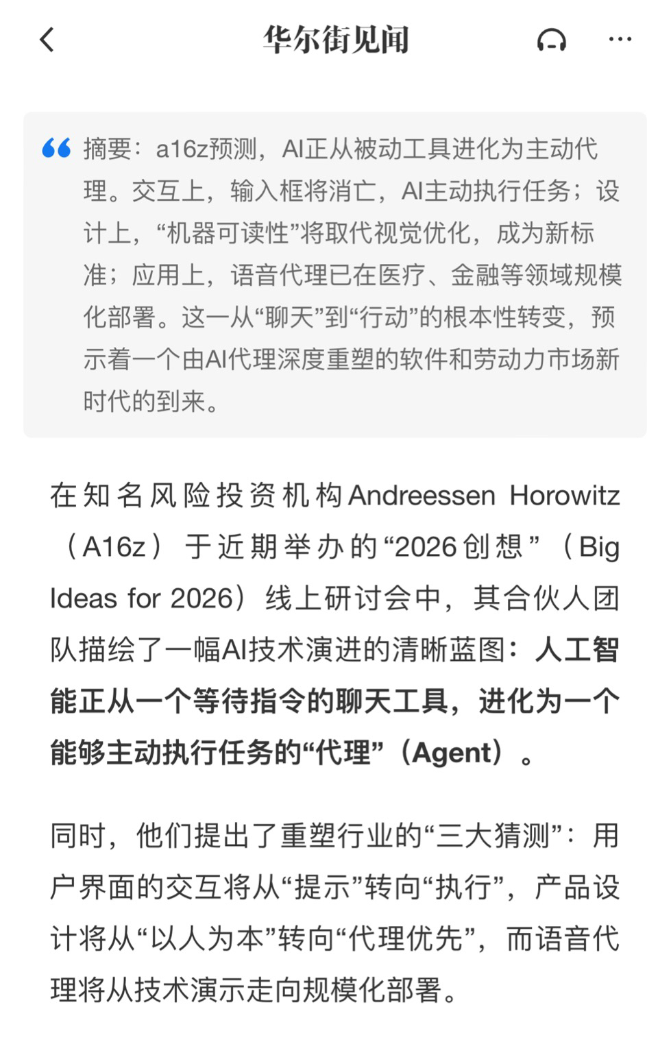 $福蓉科技(SH603327)$ 在知名风险投资机构Andreessen Horowitz(A16z)于近期举办的“2026创想”(Big Ideas for 2026)线上研讨会中,其合伙人团队描绘了一幅AI技术演进的清晰蓝图:人工智能正从一个等待指令的聊天工具,进化为一个能够主动执行任务的“代理”(Agent)。