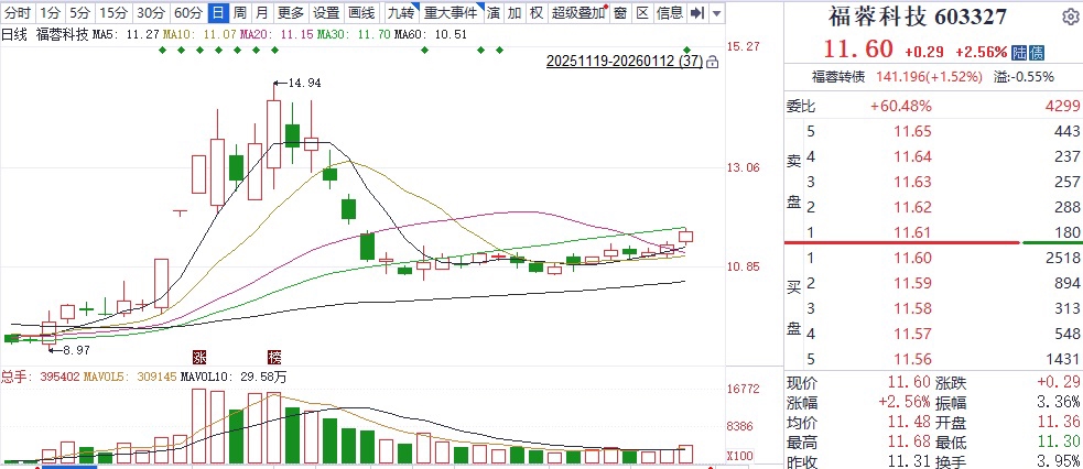 1月12日,在该消息推动下,福蓉科技股价快速反弹。截至收盘,福蓉科技股价收于11.60元,涨幅2.56%。