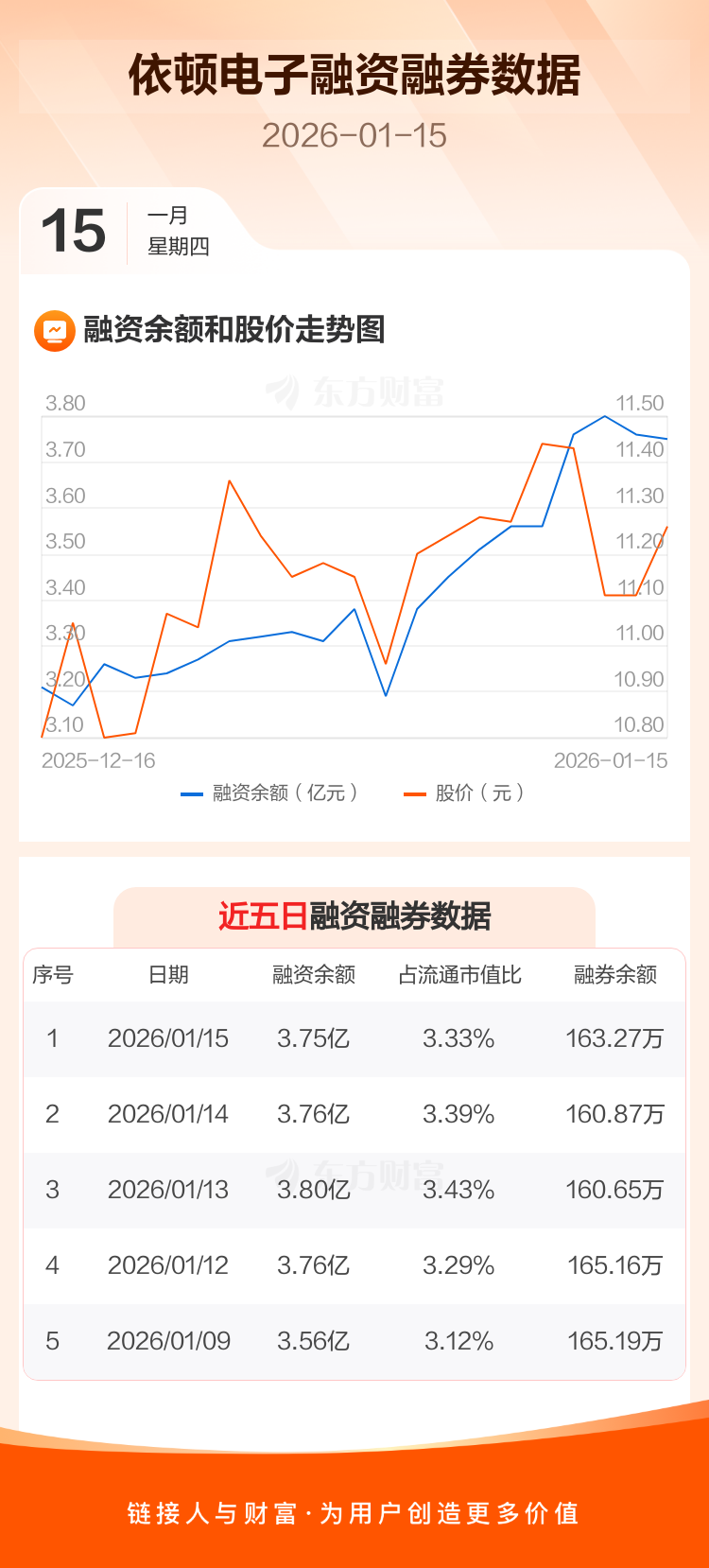 交易所最新数据显示,依顿电子于2026年1月15日获融资买入1360.89万元,融资偿还1429.53万元,当日融资净偿还68.64万元。目前,该股融资余额3.75亿,占流通市值比例为3.33%。