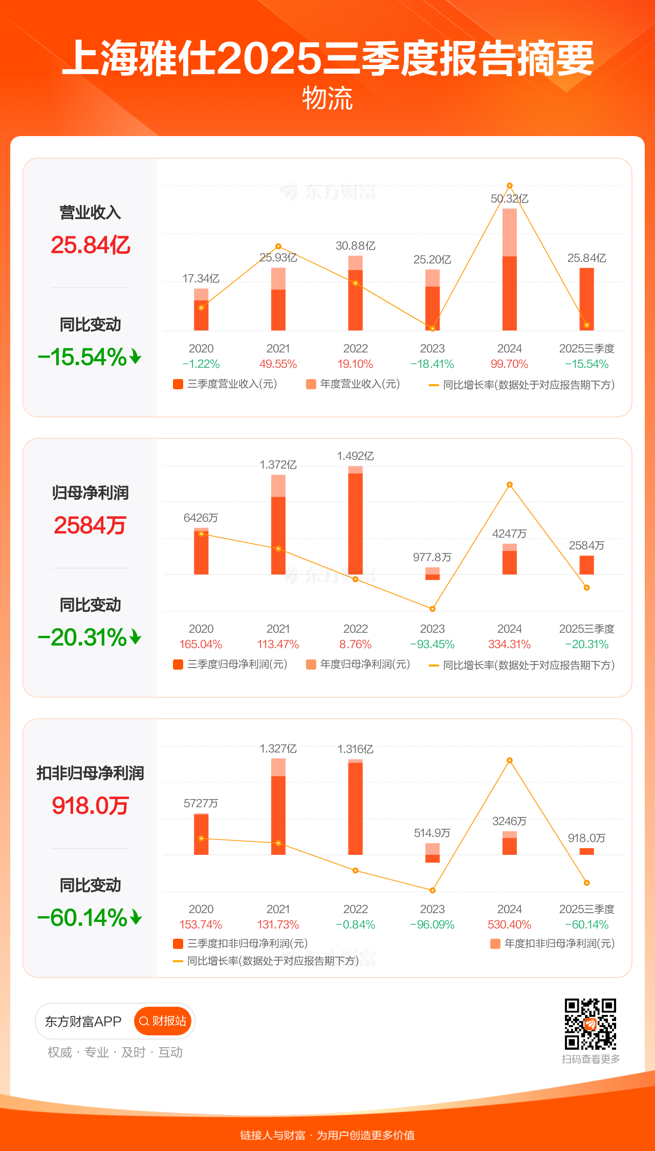 上海雅仕10月30日发布2025年三季报显示,公司前三季实现营业收入25.84亿元,同比下滑15.54%;归母净利润2584.20万元,同比下滑20.31%;扣非归母净利润917.98万元,同比下滑60.14%。