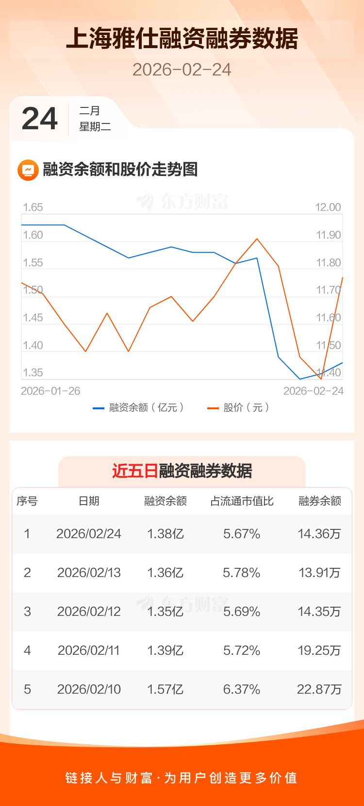 交易所最新数据显示,上海雅仕于2026年2月24日获融资买入603.86万元,融资偿还431.27万元,当日融资净买入172.58万元。目前,该股融资余额1.38亿,占流通市值比例为5.67%。