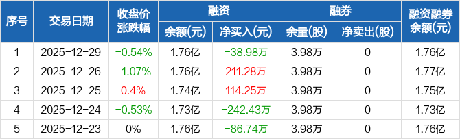 天洋新材:融资净偿还38.98万元,融资余额1.76亿元(12-29)