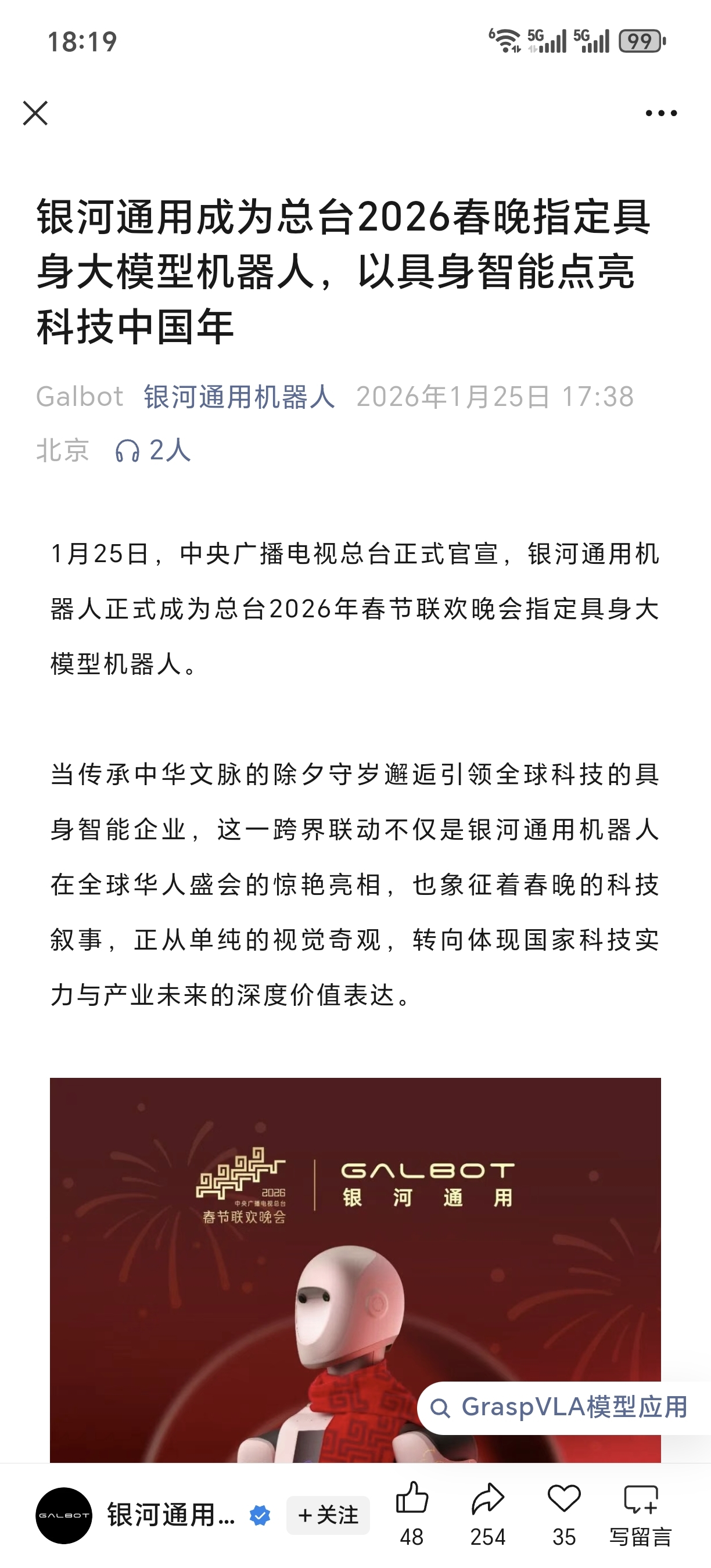 $百达精工(SH603331)$ 银河通用成为总台2026春晚指定具身大模型机器人,以具身智能点亮科技中国年
