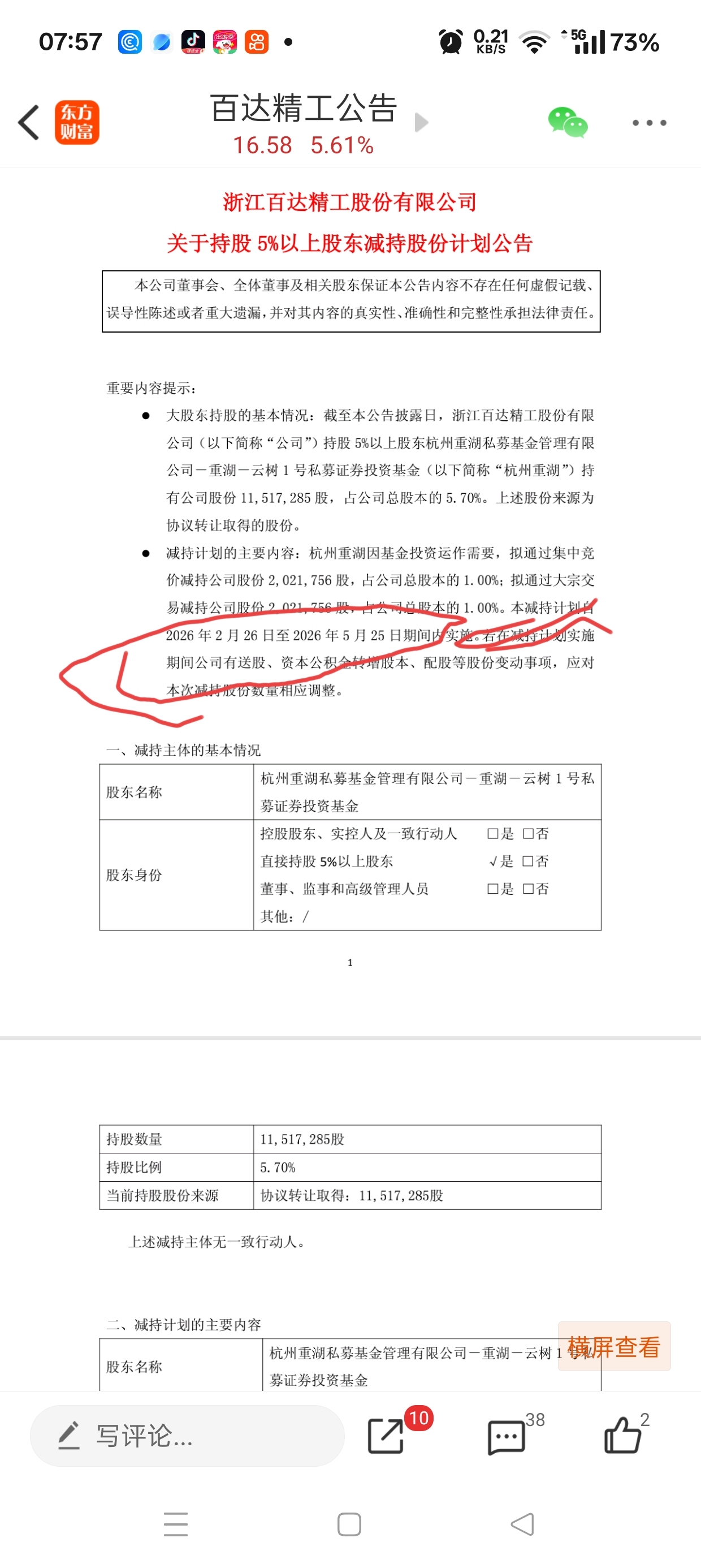$百达精工(SH603331)$ 那些说减持的春货,不看日期?现在是1月份,减持1%那个是2月份26号的事,1个月以后才可以开始减持,期间有3个月,那点筹码太少了了到时还不够主力塞牙缝!