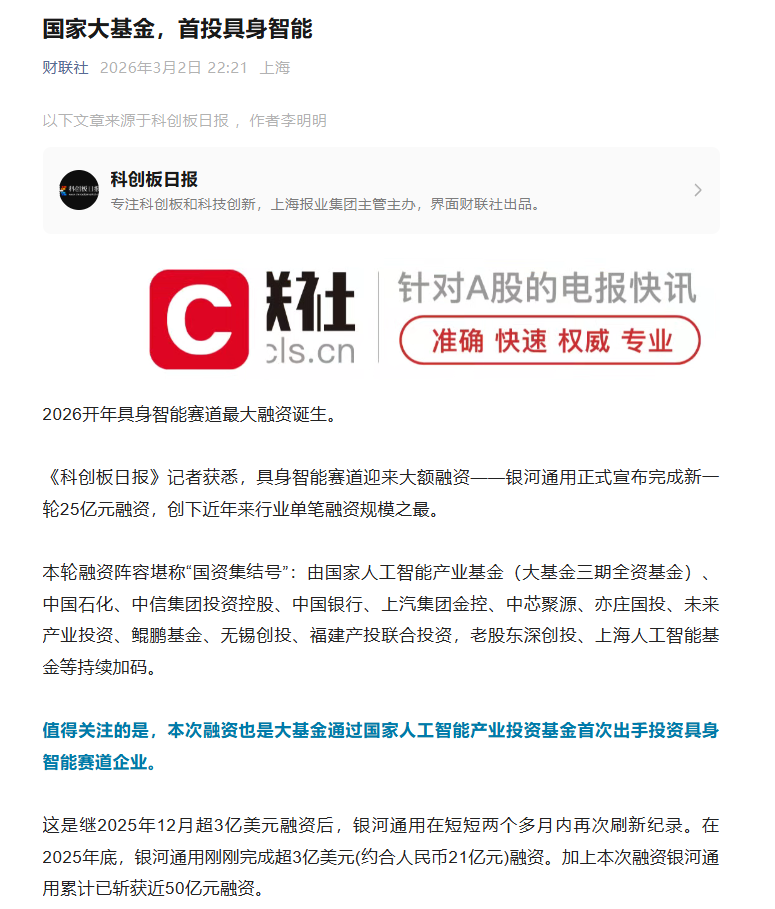 国家大基金进银河通用