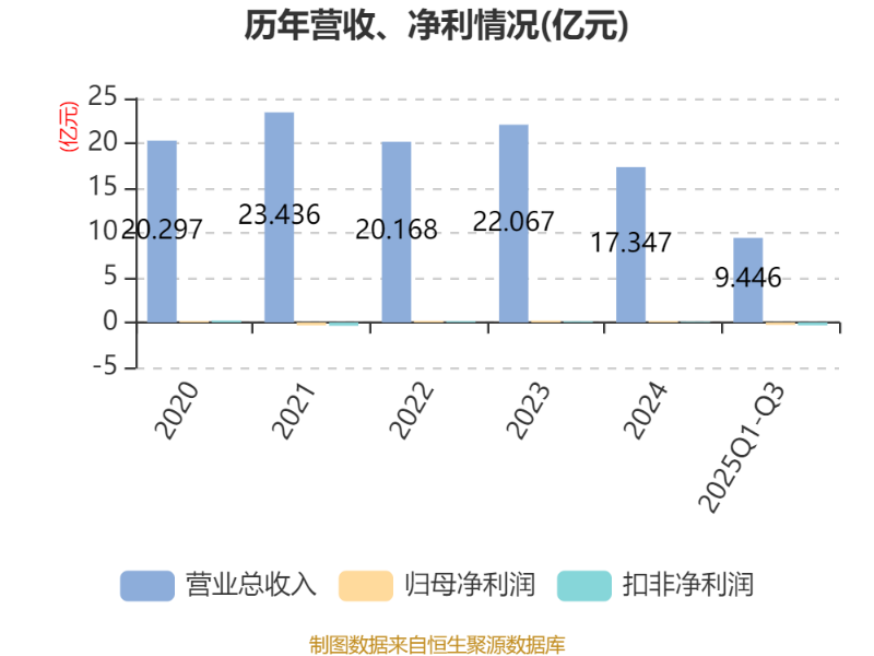 中证智能财讯尚纬股份(603333)10月18日披露2025年第三季度报告。前三季度公司实现营业总收入9.45亿元,同比下降21.12%;归母净利润亏损2568.91万元,上年同期盈利1899.76万元;扣非净利润亏损3091.14万元,上年同期盈利1863.11万元;经营活动产生的现金流量净额为-6128.19万元,上年同期为-413.03万元;报告期内,尚纬股份基本每股收益为-0.04元,加权平均净资产收益率为-1.24%。
