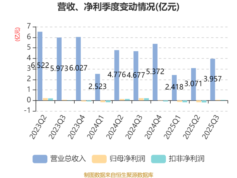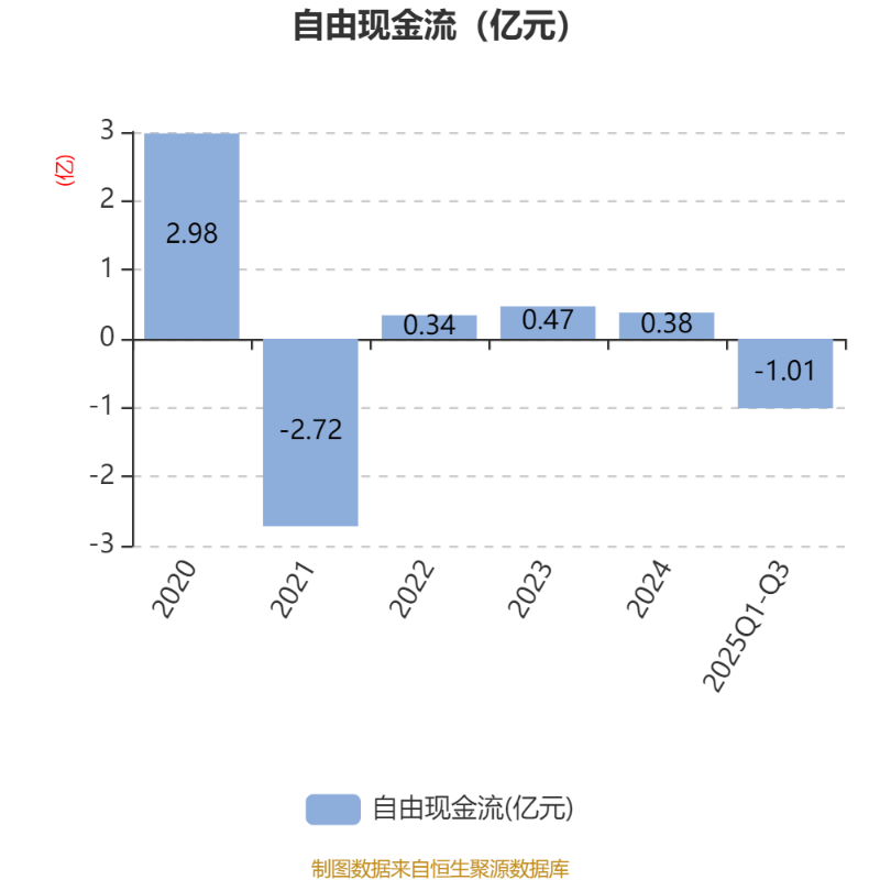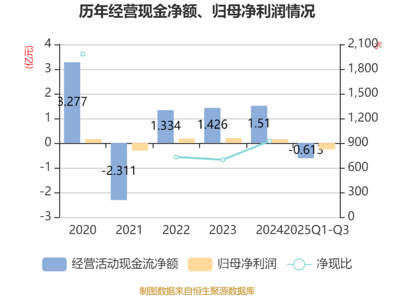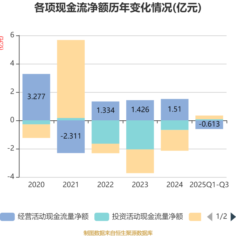 2025年前三季度,公司经营活动现金流净额为-6128.19万元,同比减少5715.16万元;筹资活动现金流净额2597.99万元,同比增加7517.19万元;投资活动现金流净额800.73万元,上年同期为-4456.5万元。