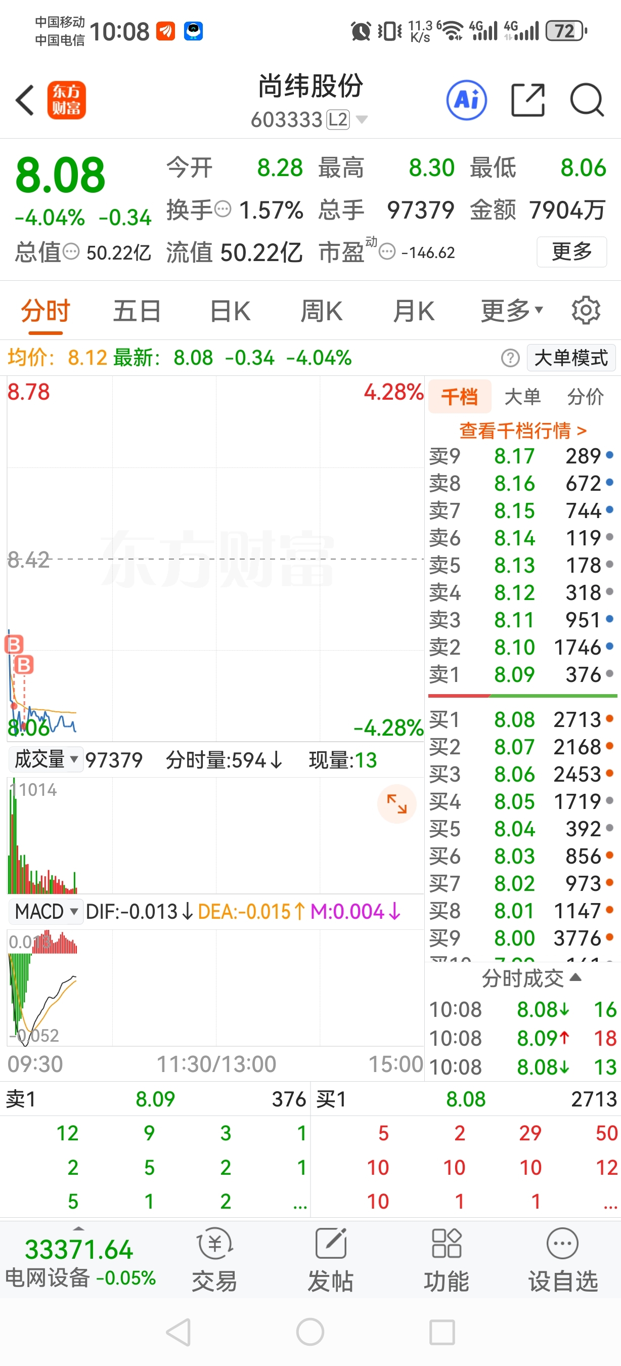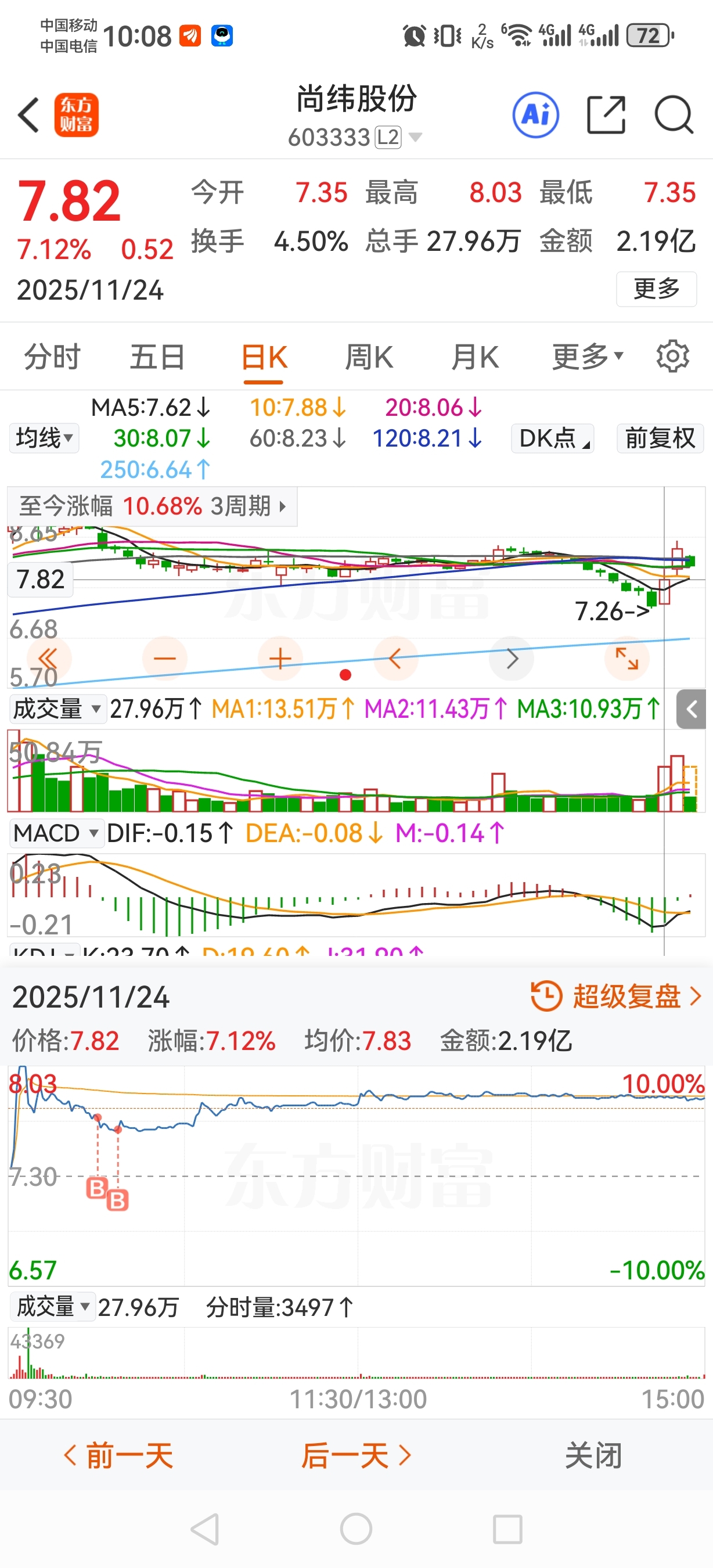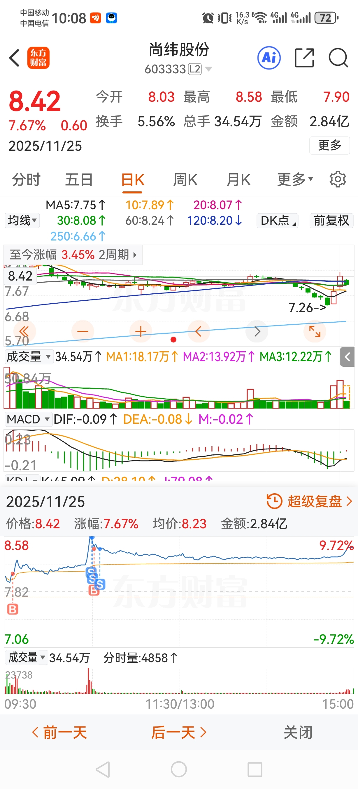 $尚纬股份(SH603333)$ 盘面已经给出来了。一种情况今天收星明天新高上冲直接往上走,另一种就是半年线附近横盘震荡消化平台的套牢盘!在向上走!目前10个多点的利润,就在这做t跟主力玩一段期间了