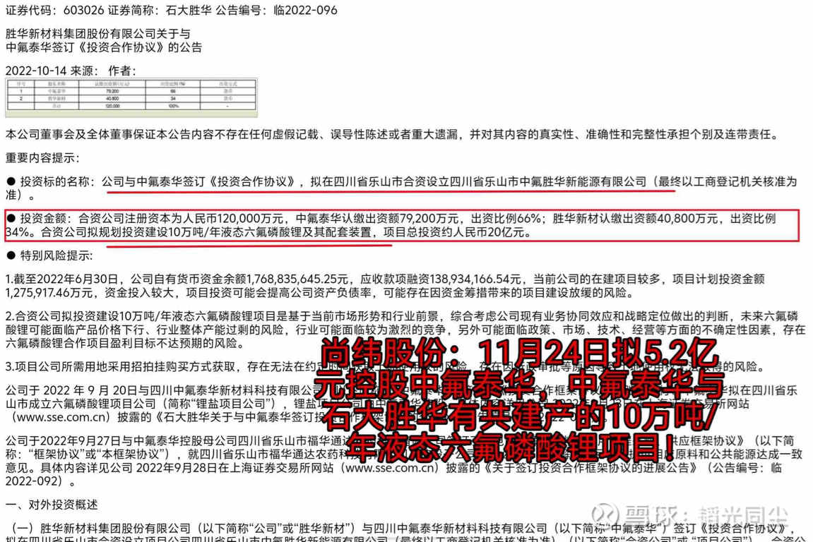 $尚纬股份(SH603333)$ 拟5.2亿元控股中氟泰华,中氟泰华与石大胜华共建的10万吨/年六氟磷酸锂项目