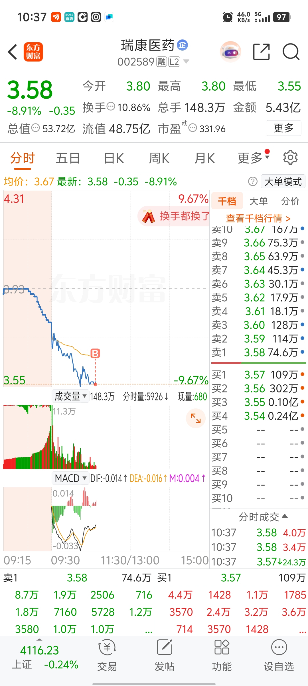$尚纬股份(SH603333)$ 昨天买入搏反抽,今天连20日线都跌穿了,破位-3%止损了,不留恋了,早盘要是猛跌或者还有机会,深水可以洗盘,但慢跌就没底了,少输当赢。接着再抄$瑞康医药(SZ002589)$ ,早盘就杀深水,这种型态可以搏一下,-9%以下买亏损可控,今天搏不到反抽明天竞价就止损