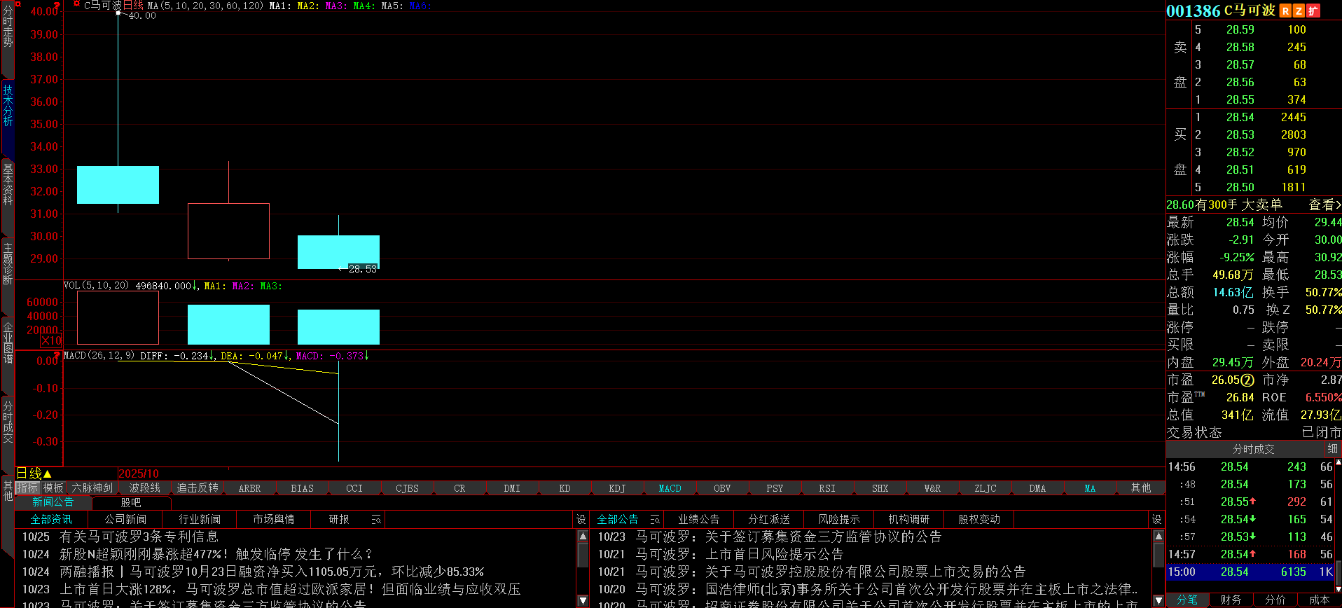 马可波罗于10月22日上市交易,主营建筑陶瓷,看上去业绩不错,13.75元的发行价,但目前上市流通股份还不到总股份的10%,大股东以极其低廉的成本控制着约80%股份,实在没什么太多想象空间,上市首日以33.1元开盘,短时间冲高后大幅回落震荡走低收带长上影线的中阴线,第二日毫无意外地大幅低开,盘中虽然翻红摸到首日开盘价附近,第三日再低开低走收中阴线,股价创上市后新低。基本应验了首日盘后认为该股短期甚至中长期走势基本废了的看法。