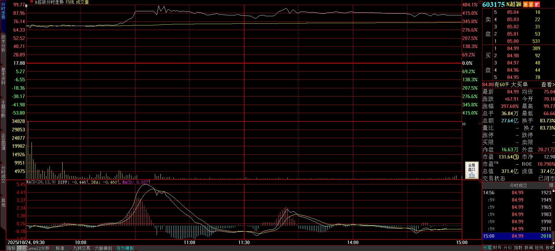 超颖电子于10月24日上市交易,该股主营印制电路板,发行价17.08元,首日上市流通股份约4400万股,占总股份近10%,由于印制电路板(PCB)在当前市场较热门,直接以70.1元开盘,涨幅310.4%,总高值306.36亿元,TTM市盈率124倍。开盘下探到66.66元后一直在70元下方震荡,至上午10点多换手率超过50%时开始上行,于10:30稍过即冲至91.13元临停,临停结束后没有更多惊喜,股价维持高位宽幅震荡,最终 收于84.99元,总市值371.4亿元,TTM市盈率150倍。虽然题材热门,但前三季营收增长的同时净利润及扣非净利润均下滑10%以上,首日这个定位实在是太高了。