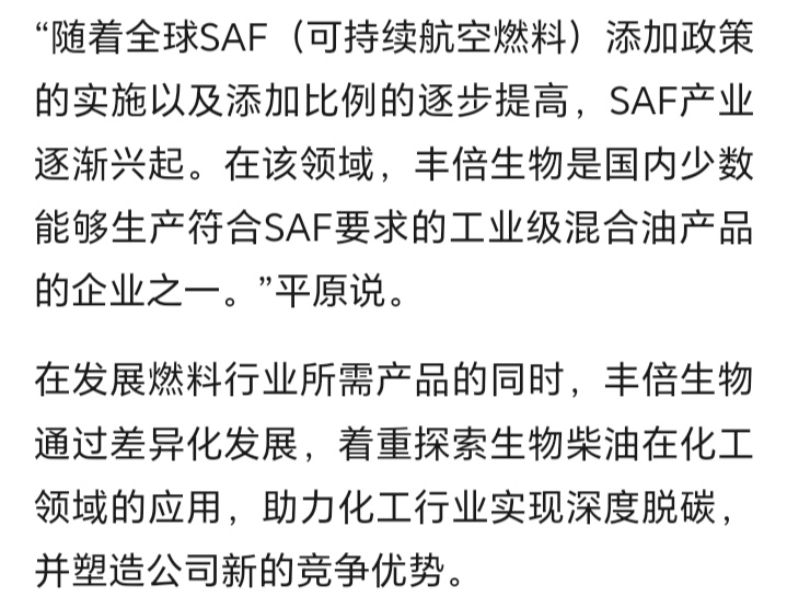 “随着全球SAF(可持续航空燃料)添加政策的实施以及添加比例的逐步提高,SAF产业逐渐兴起。在该领域,丰倍生物是国内少数能够生产符合SAF要求的工业级混合油产品的企业之一。”平原说。