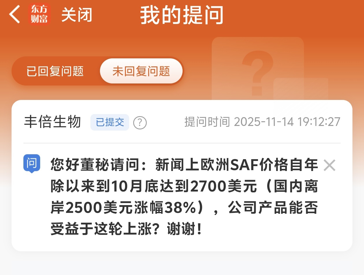 $丰倍生物(SH603334)$ 我向公司发起询问是否存在受益于欧洲今年 (SAF)涨价60%