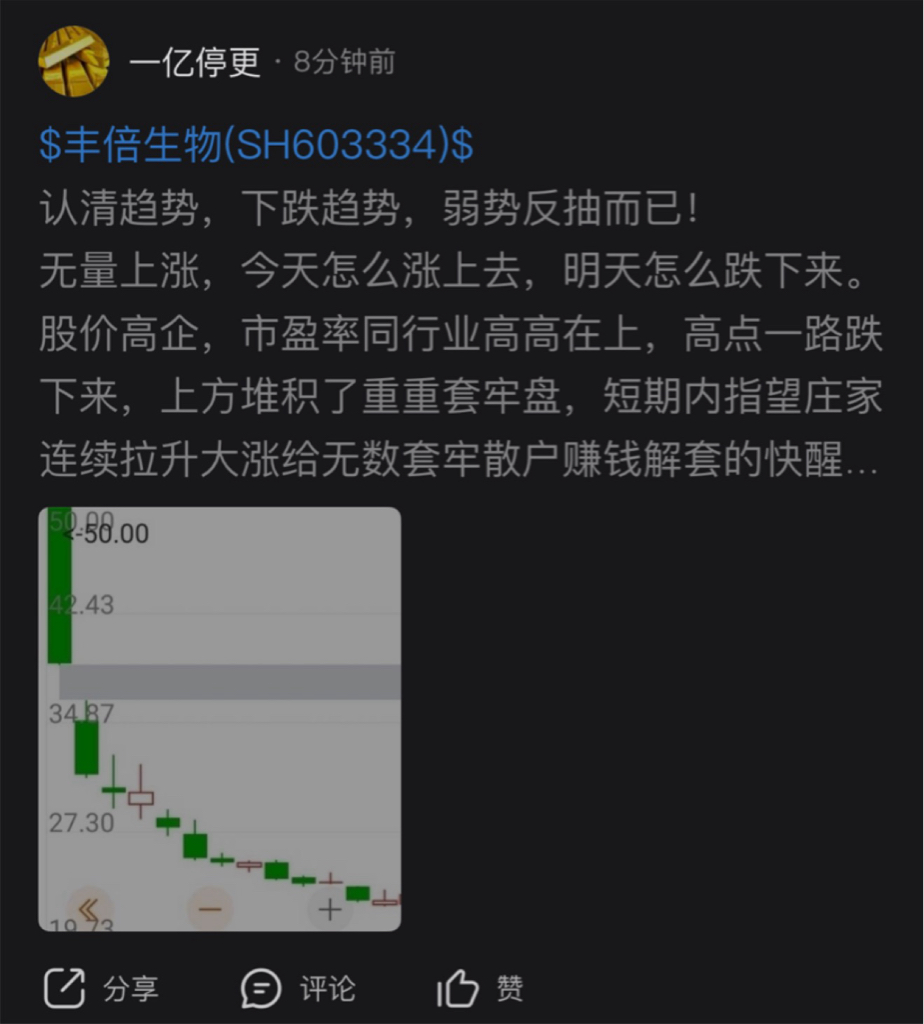 $丰倍生物(SH603334)$ 这个唱空的人怎么每个交易日都来呢?还每次都是同一段话同一幅图。是机器人吗?股票价格是无法预测的,好好去学学经济学吧。这个人要是真的灵,早财务自由了,怎么还会来这里?我爸和呼家楼老板就从来不玩股吧,还叫我别玩,奈何我性格和他俩完全不同,喜欢热闹。