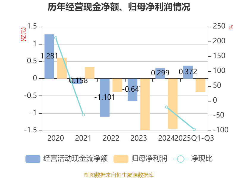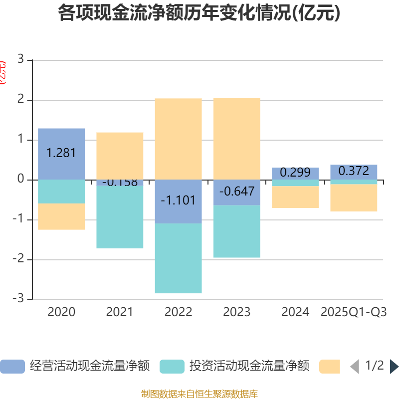 2025年前三季度,公司经营活动现金流净额为3716.08万元,同比下降56.23%;筹资活动现金流净额-6790.91万元,同比减少1214.41万元;投资活动现金流净额-1202.81万元,上年同期为-8345.58万元。