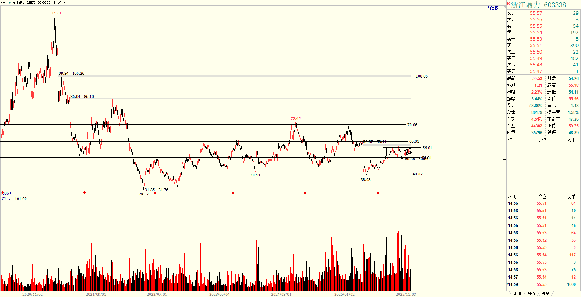 一把直尺打天下/浙江鼎力总体在40-60的箱体内运动,上涨潜力巨大;现阶段,股价