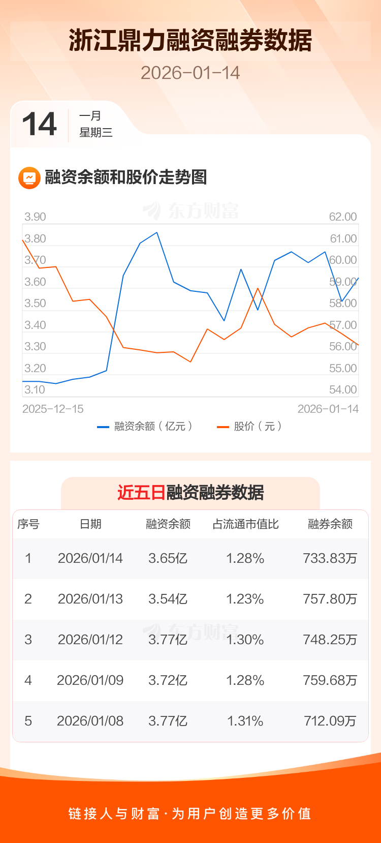 交易所最新数据显示,浙江鼎力于2026年1月14日获融资买入3995.45万元,融资偿还2913.13万元,当日融资净买入1082.31万元。目前,该股融资余额3.65亿,占流通市值比例为1.28%。