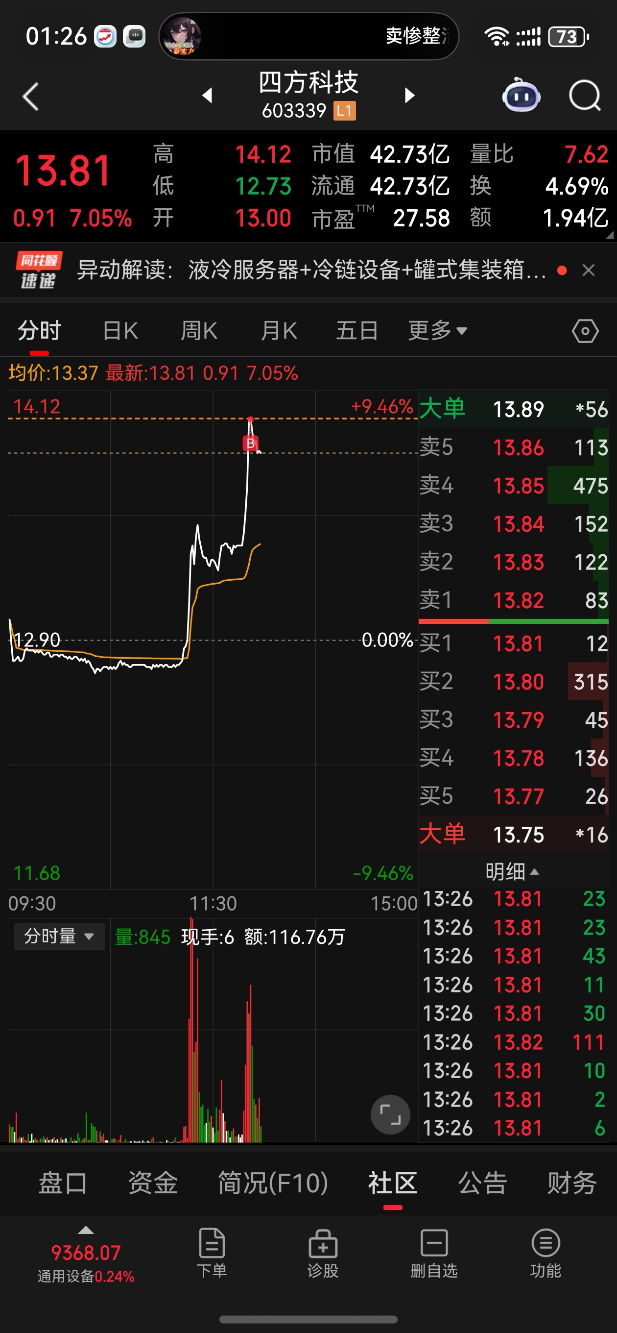 $四方科技(SH603339)$ 好,有点冷