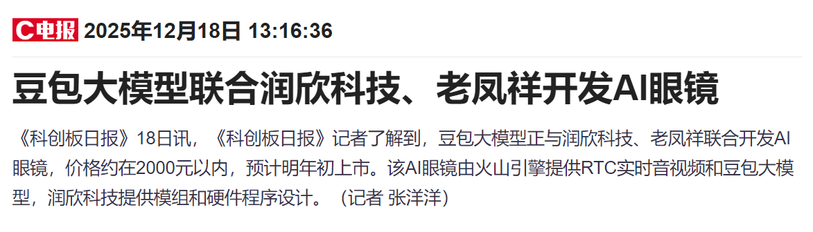 豆包大模型联合润欣科技、老凤祥开发AI眼镜