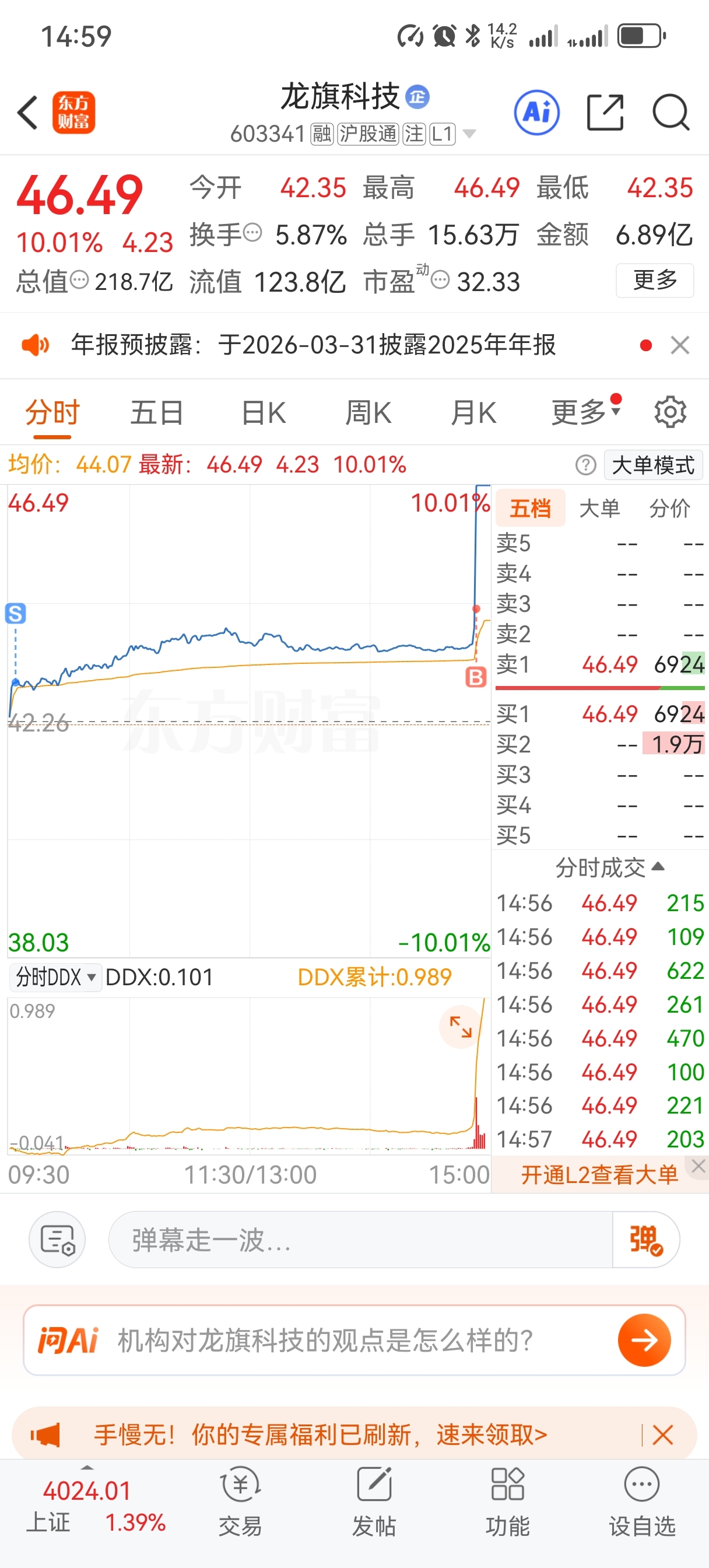 $龙旗科技(SH603341)$ 不错不错 最后几分钟又进了