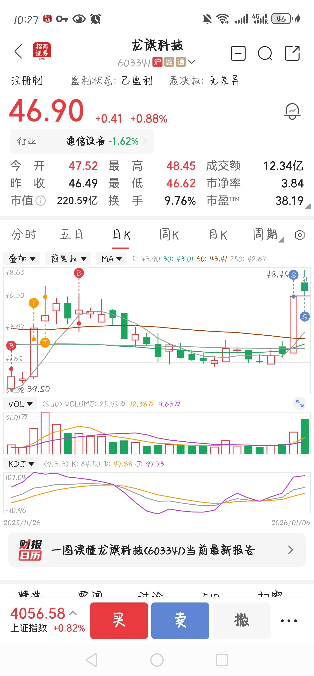 $龙旗科技(SH603341)$ 早盘挂单47.99卖。留1/3仓位在里面放长线了,成本33块,毕竟这一轮应该是需要时间消化筹码了,不会那么快下一轮拉升#炒股日记#
